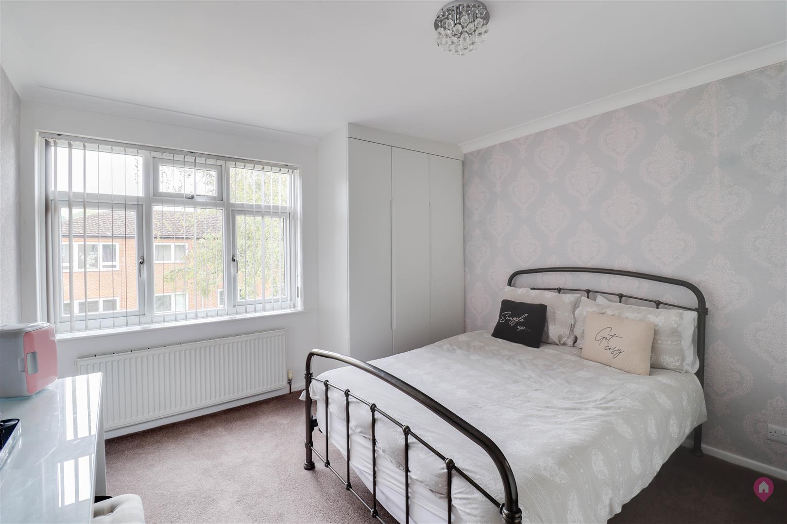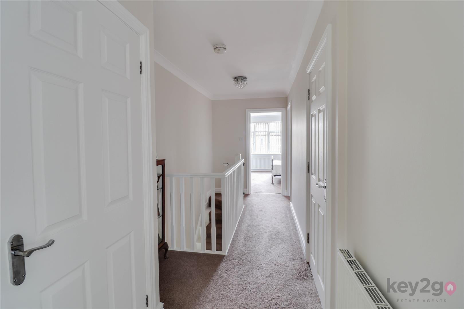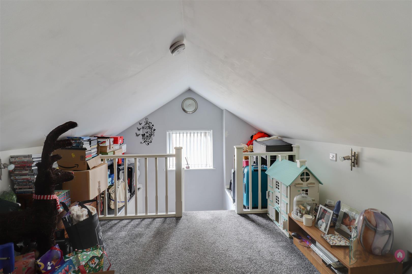 Stairs with a carpet runner and exposed edges create a stylish, neutral look leading to a large, spacious landing with ample storage. The landing provides access to the bedrooms, bathroom, and stairs to the attic room. Bedroom one is a double with carpet, window, and two fitted wardrobes. Bedroom two is also a double with neutral décor, carpet, window, and panelled areas. Bedroom three is neutral with carpet, an open under-stairs space, and a window. The attic room is accessed via a staircase and offers a spacious, carpeted area with a window.