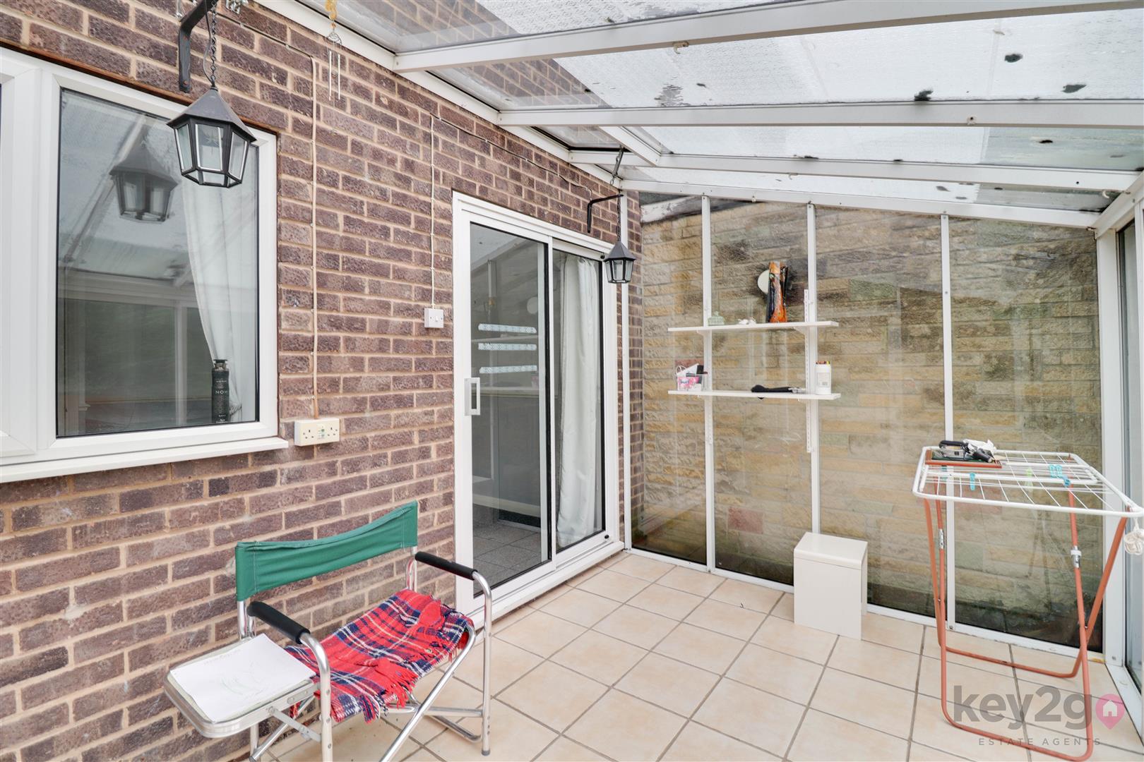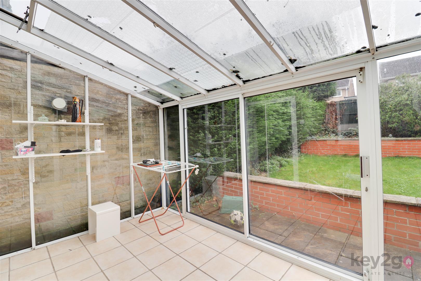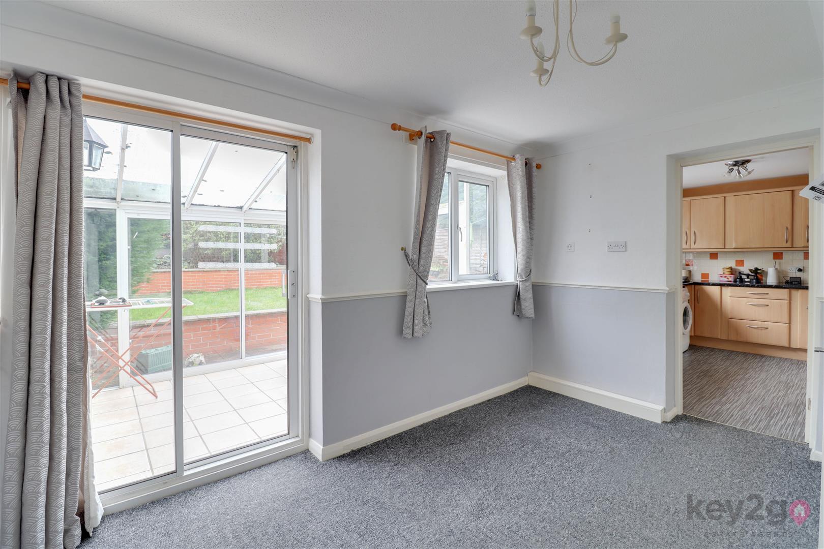 UPVC door leads to the porch area with neutral décor, storage, carpet, and an obscure window. The spacious lounge includes neutral décor, carpet, a fireplace, and stairs. The dining room has carpet, storage, double sliding doors to the conservatory, and access to the kitchen. The kitchen offers ample base and wall units, contrasting worktops, a freestanding double oven, a door leading to the garage, vinyl flooring, and a sink with a window overlooking the garden. The conservatory features tile flooring, windows, a door leading to the rear, and is bright and spacious.
