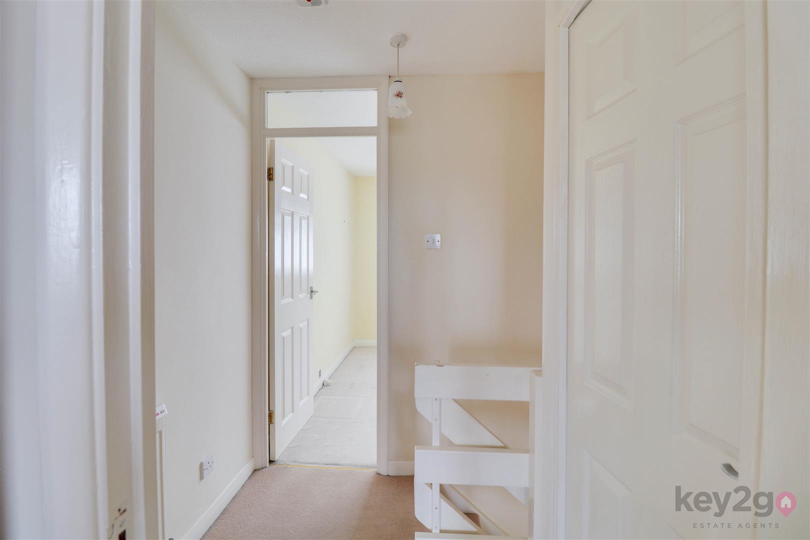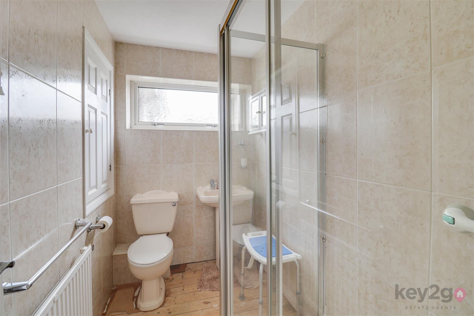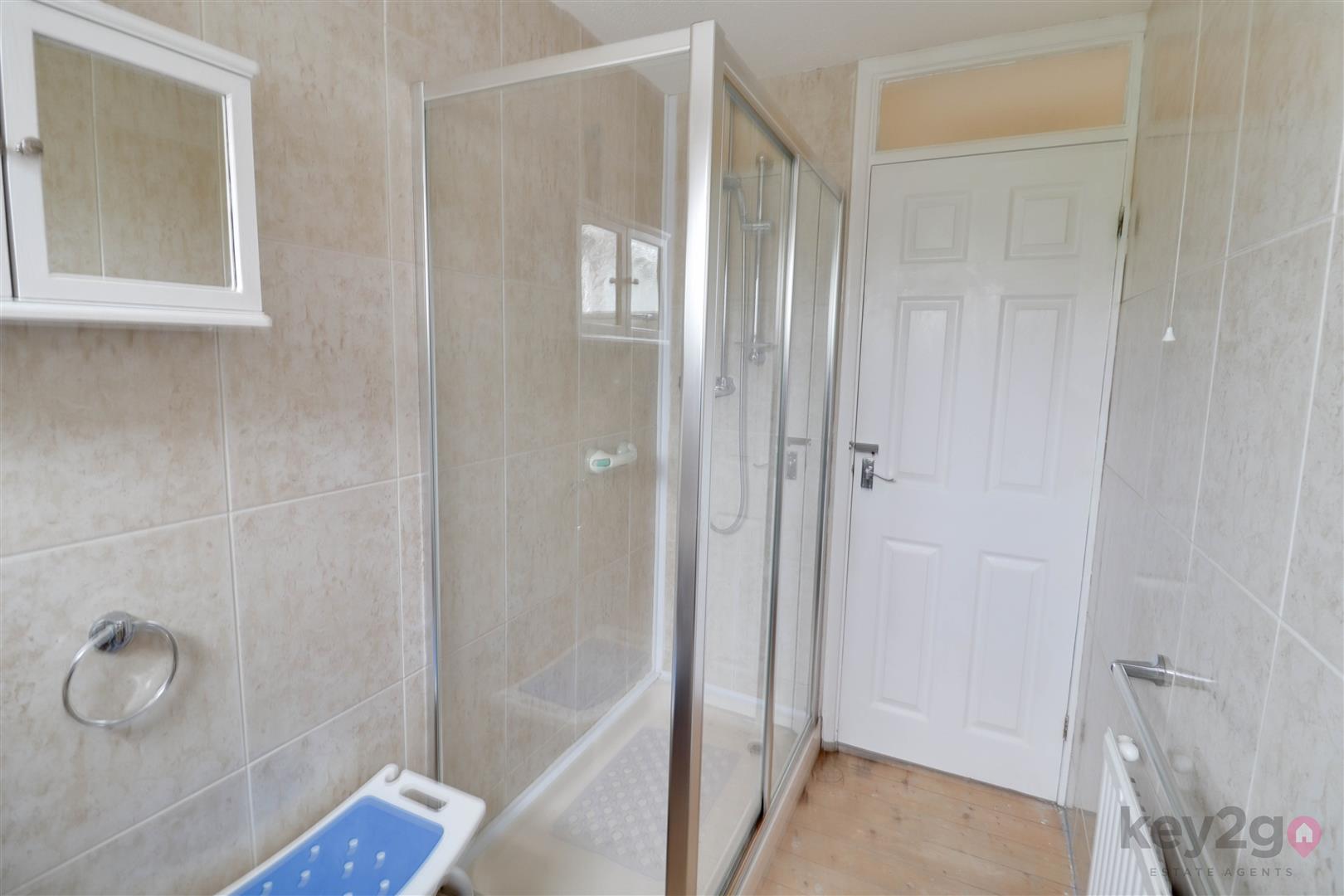 The stairs and landing have neutral décor, carpet, and provide access to the bedrooms and bathroom. Bedroom one is a double with carpet and two windows. Bedroom two is a double with carpet and a window, while bedroom three is also a double with carpet and a window. The shower room includes neutral tiling, a toilet, a walk-in shower unit, a sink, an obscure window, and storage.