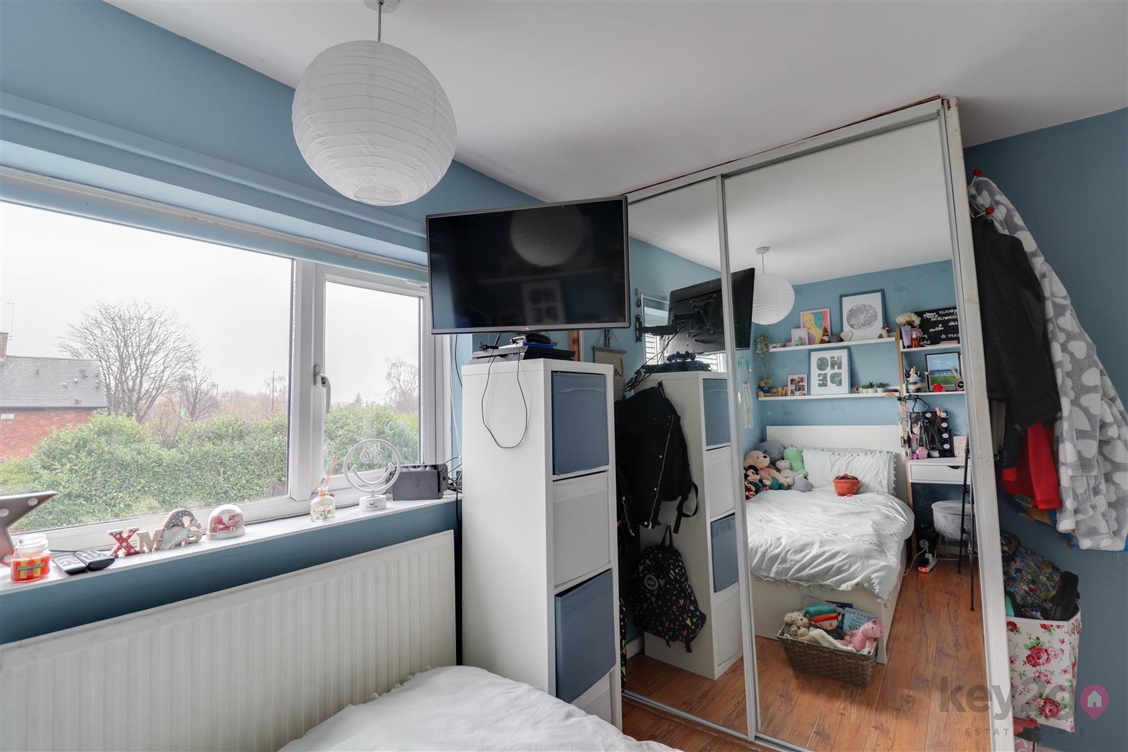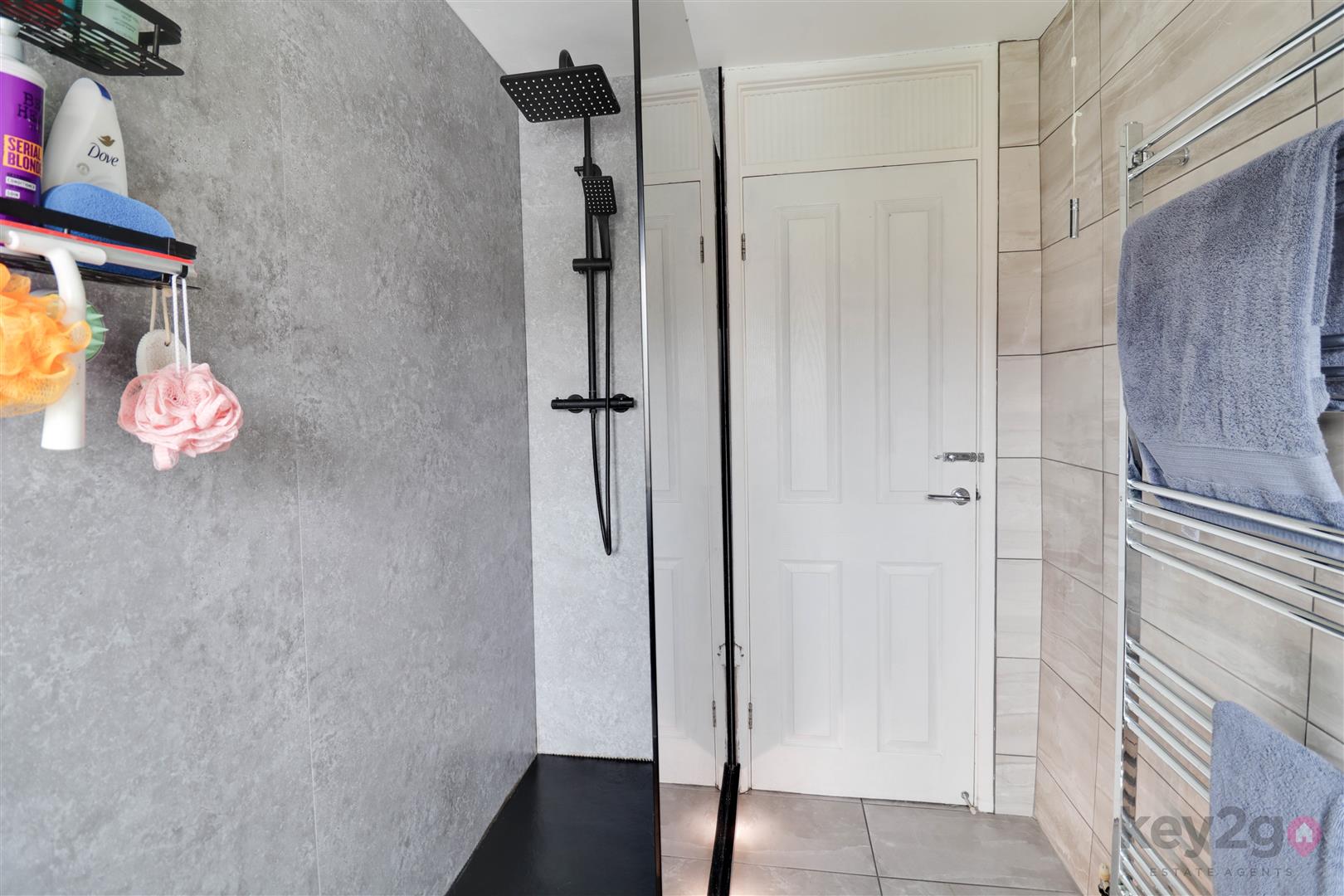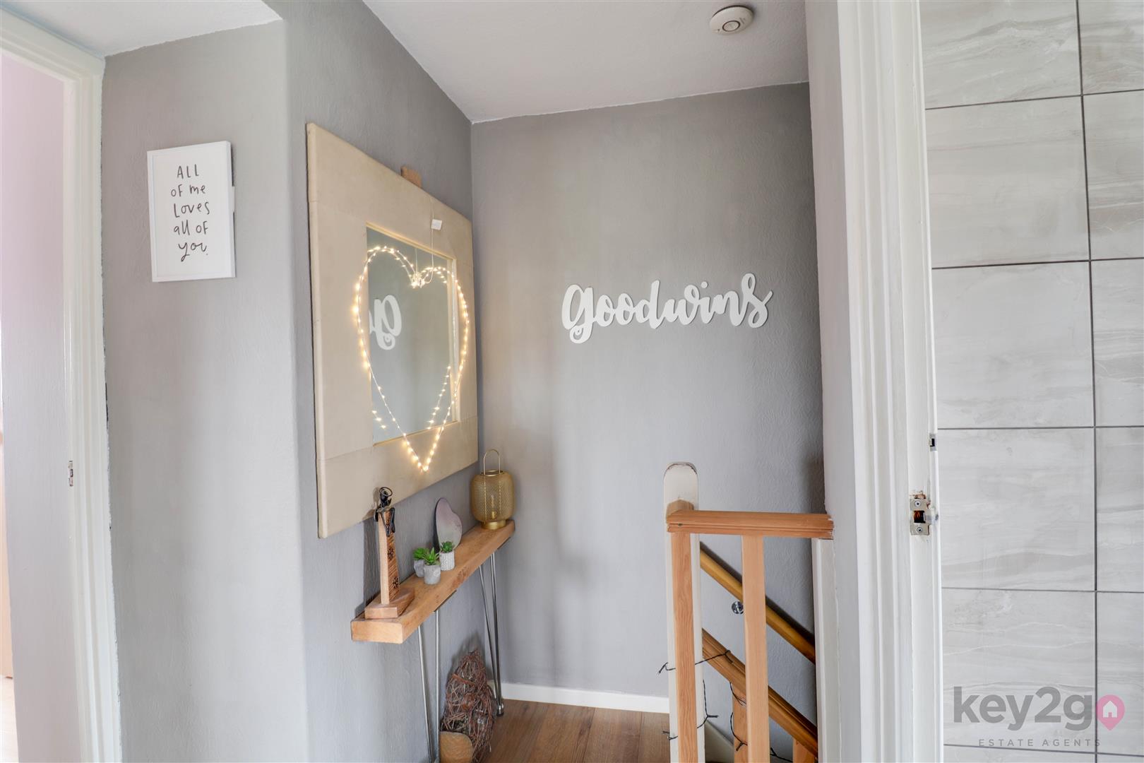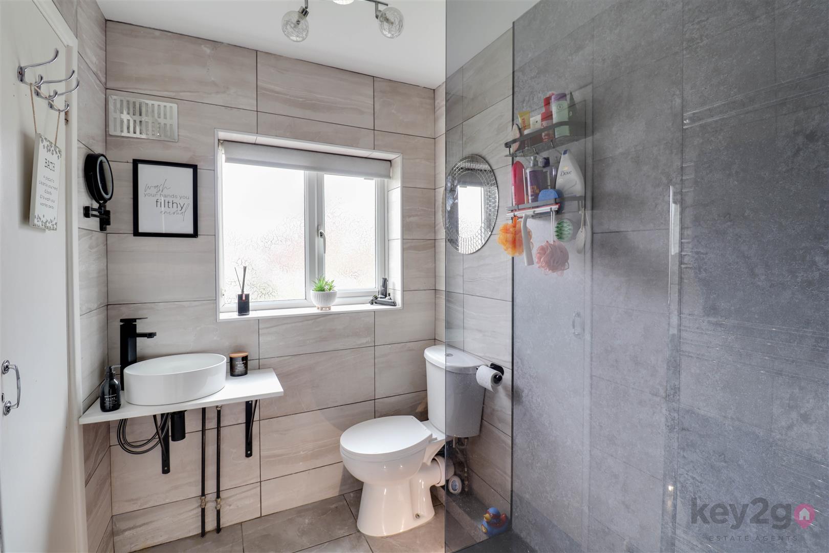 The stairs and landing are carpeted and provide access to bedroom one which is a spacious double with two windows, laminate flooring, and panelling. Bedroom two is a double with laminate flooring, fitted wardrobes, and a window, while bedroom three is a single with fitted wardrobes and a window. The shower room is modern and stylish, featuring a large walk-in shower unit with overhead and handheld shower, a toilet, sink with storage, and an obscure window.