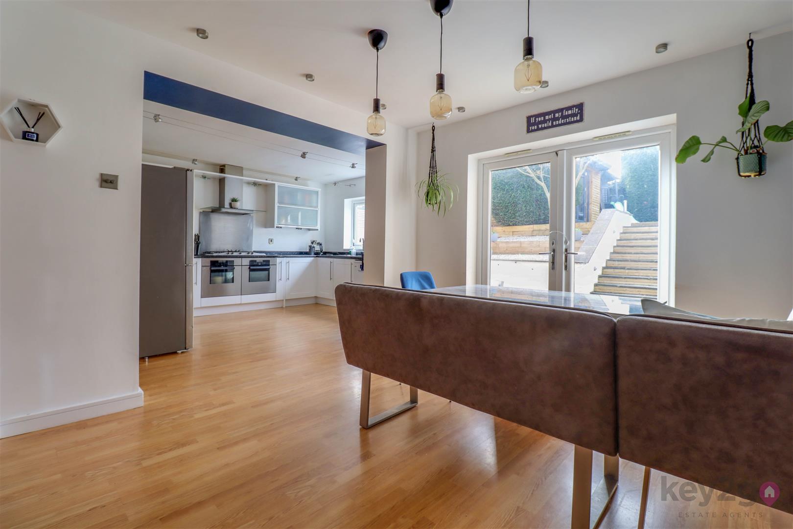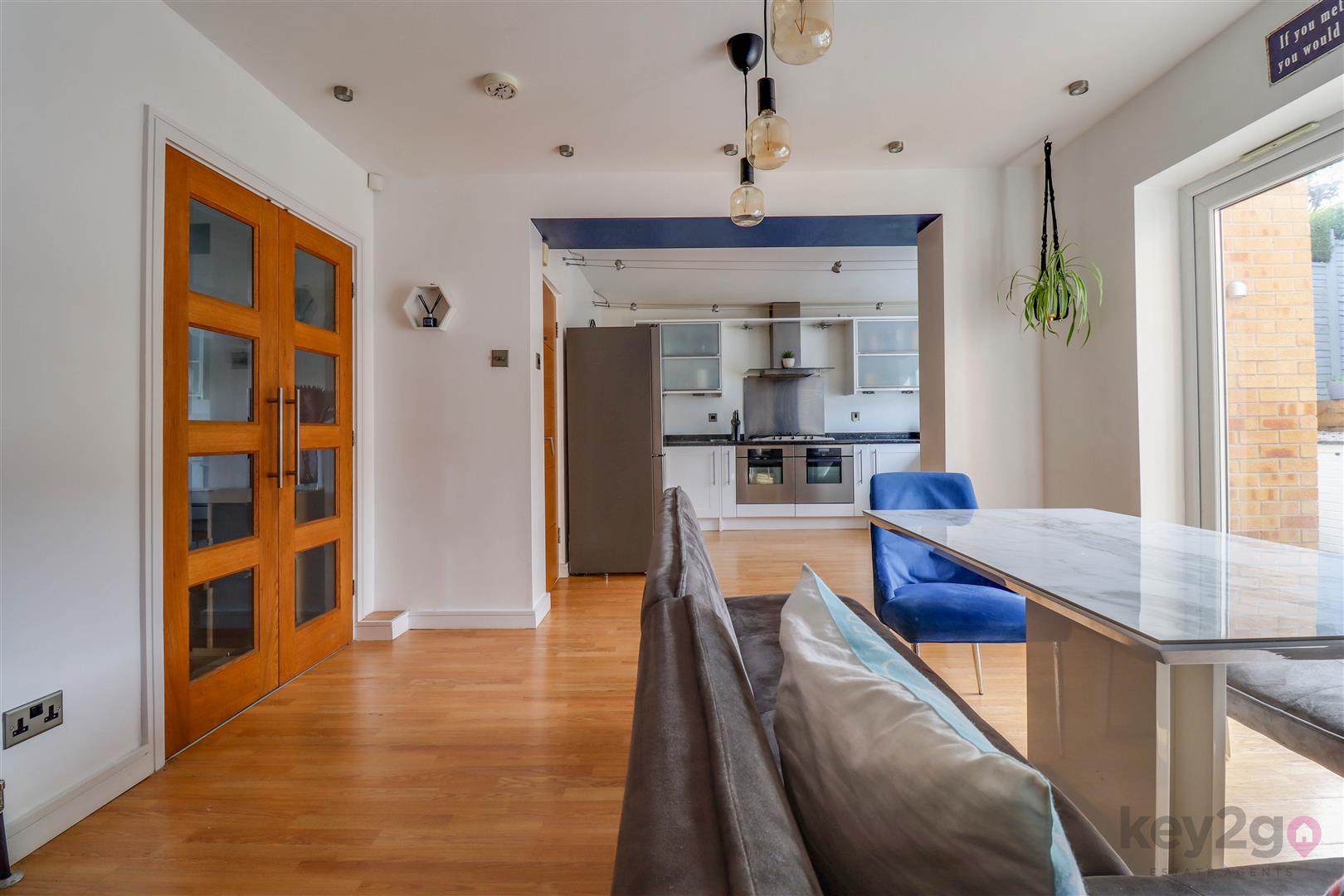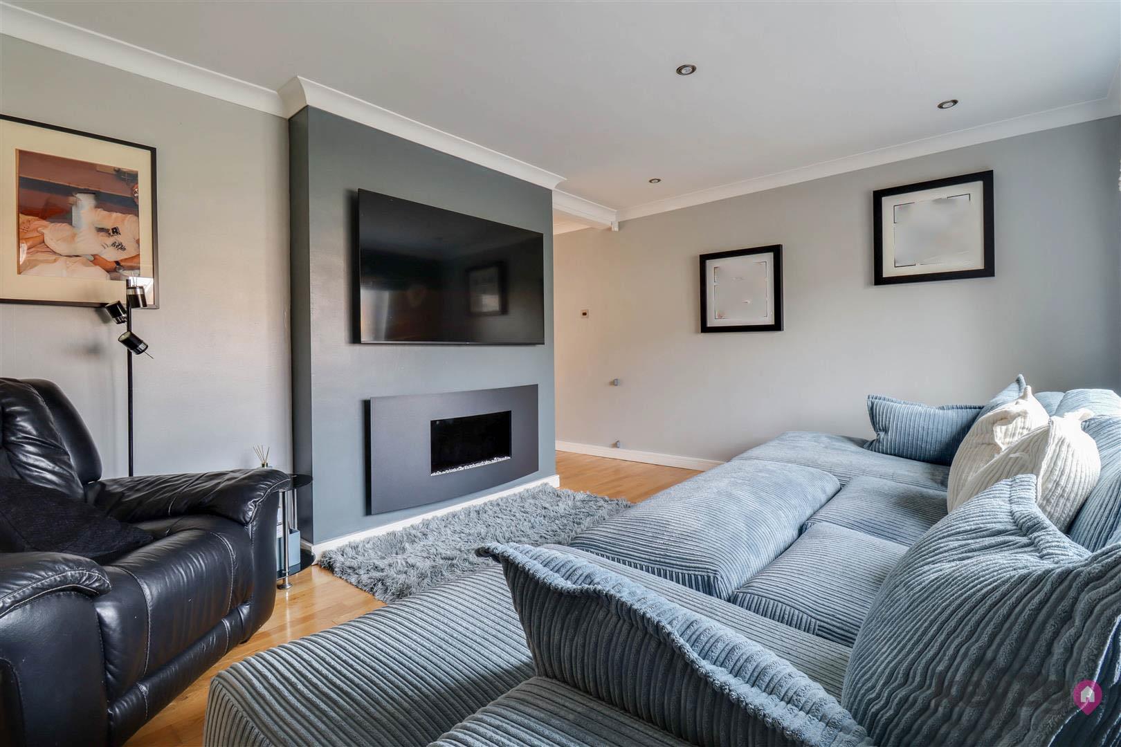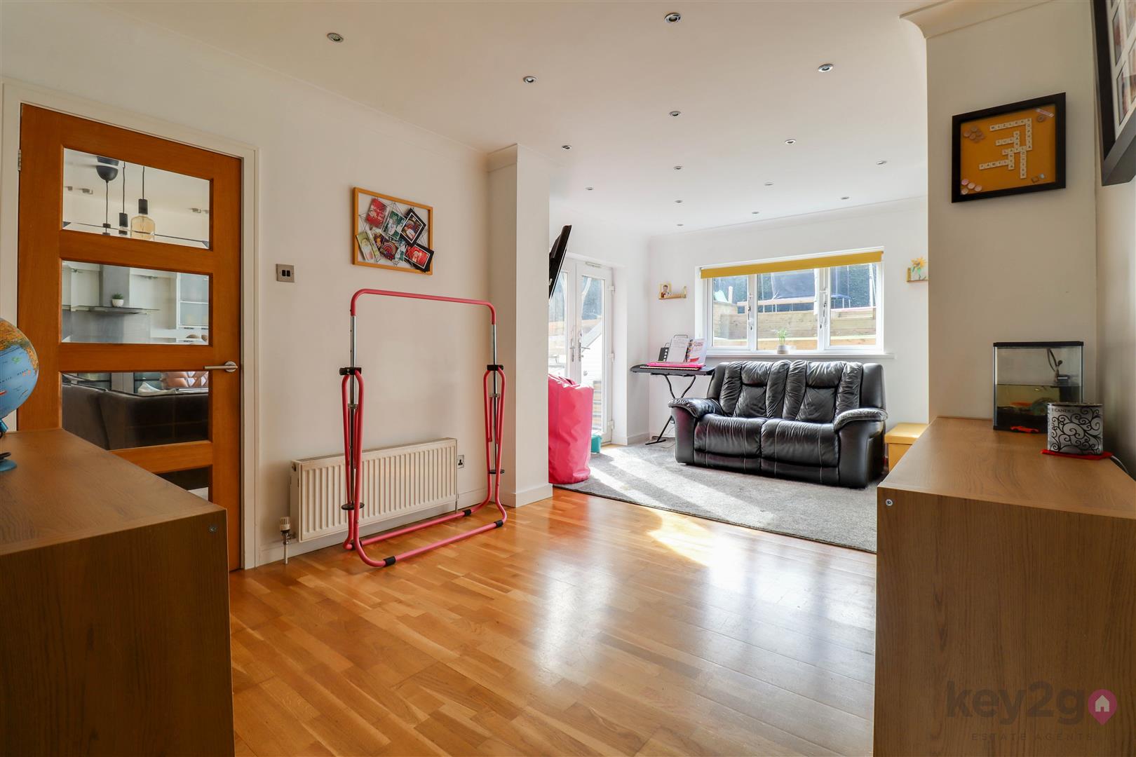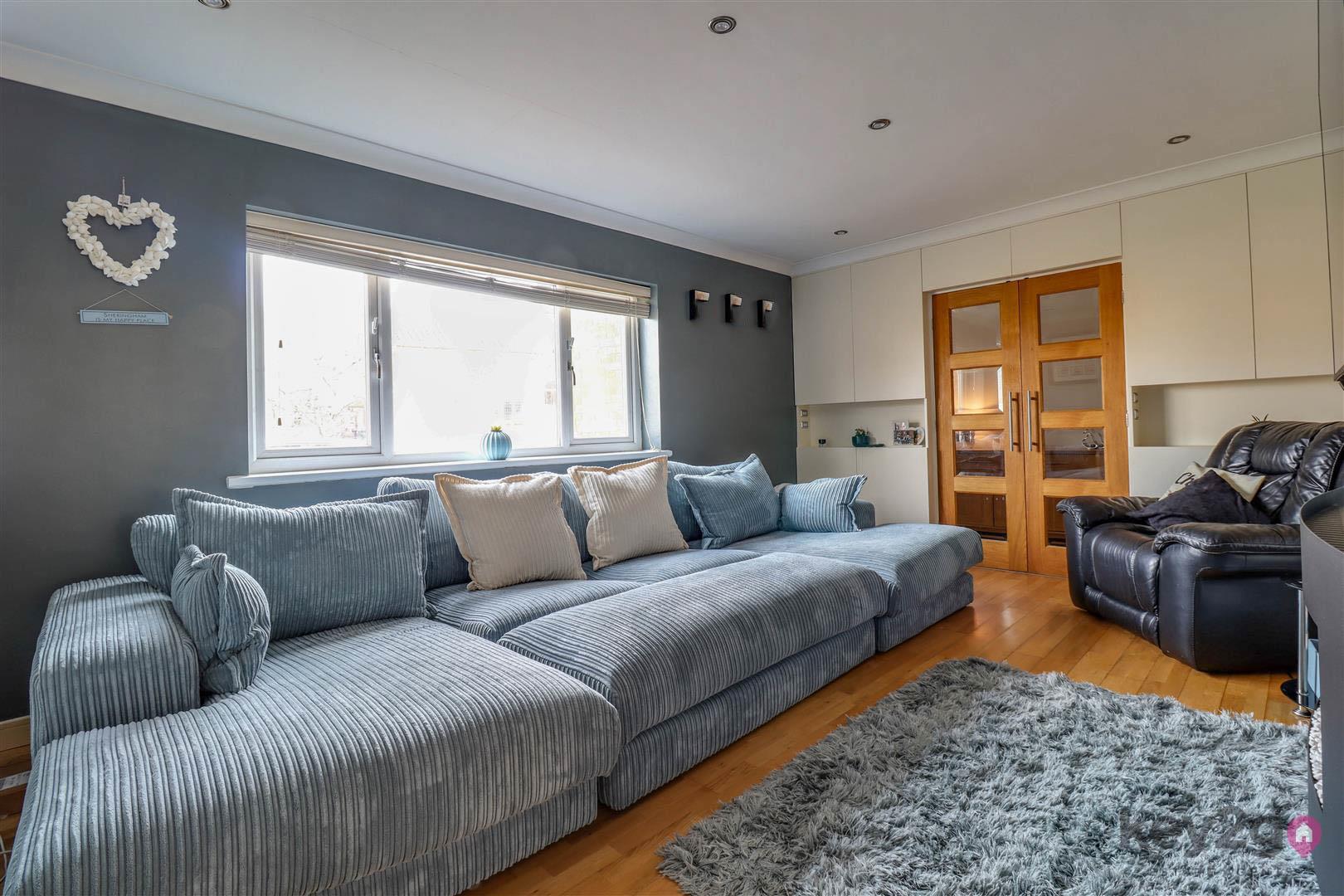 The lounge offers a warm and cosy retreat, complete with a stylish feature media wall, and flows seamlessly into the rear family room. This versatile additional reception space is flooded with natural light and benefits from double doors opening out to the garden, as well as access back through to the kitchen—ideal for modern family living and entertaining.
