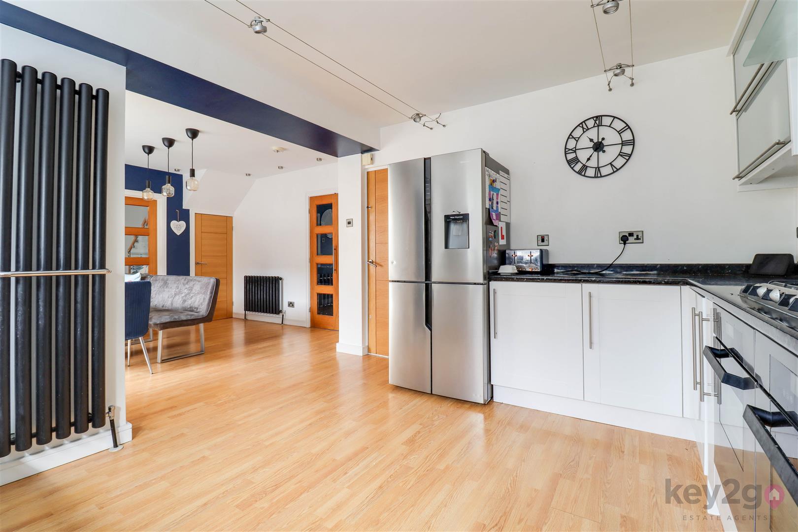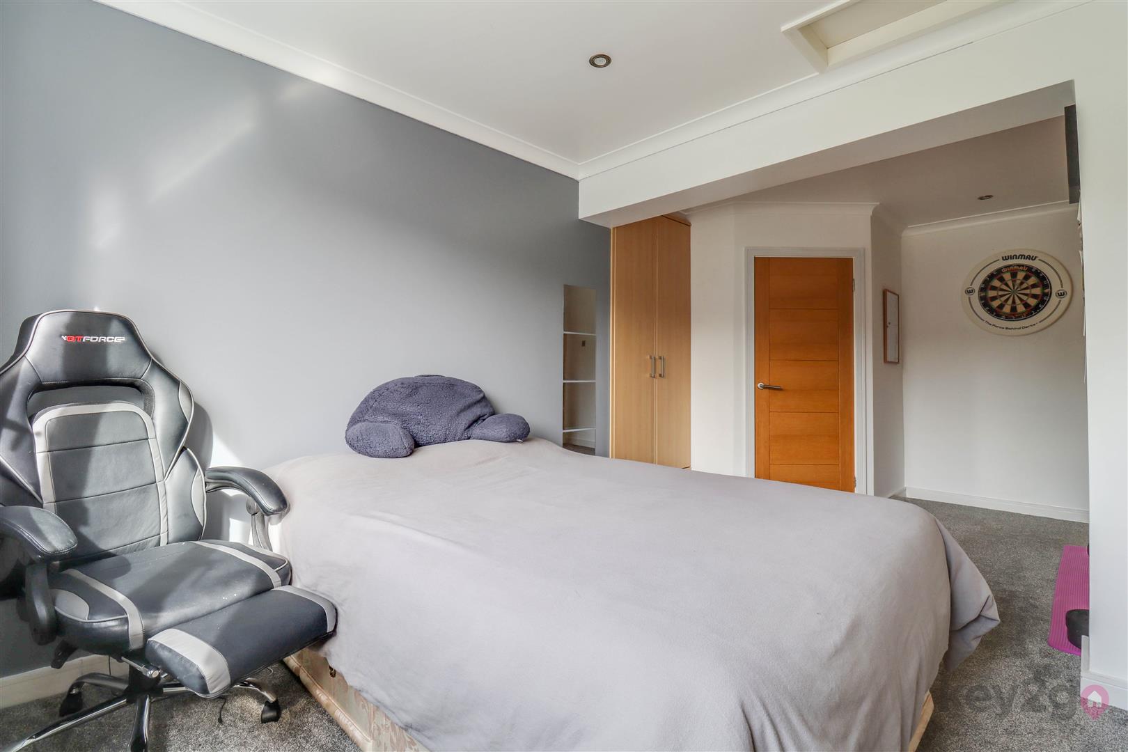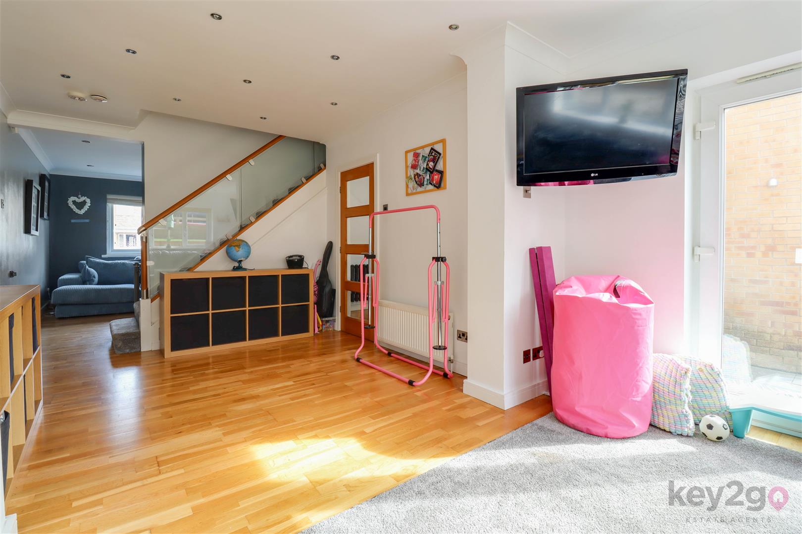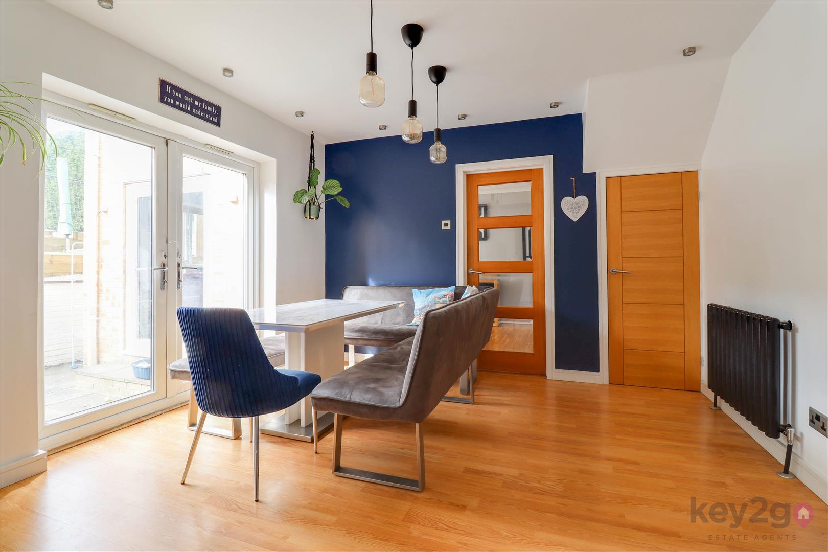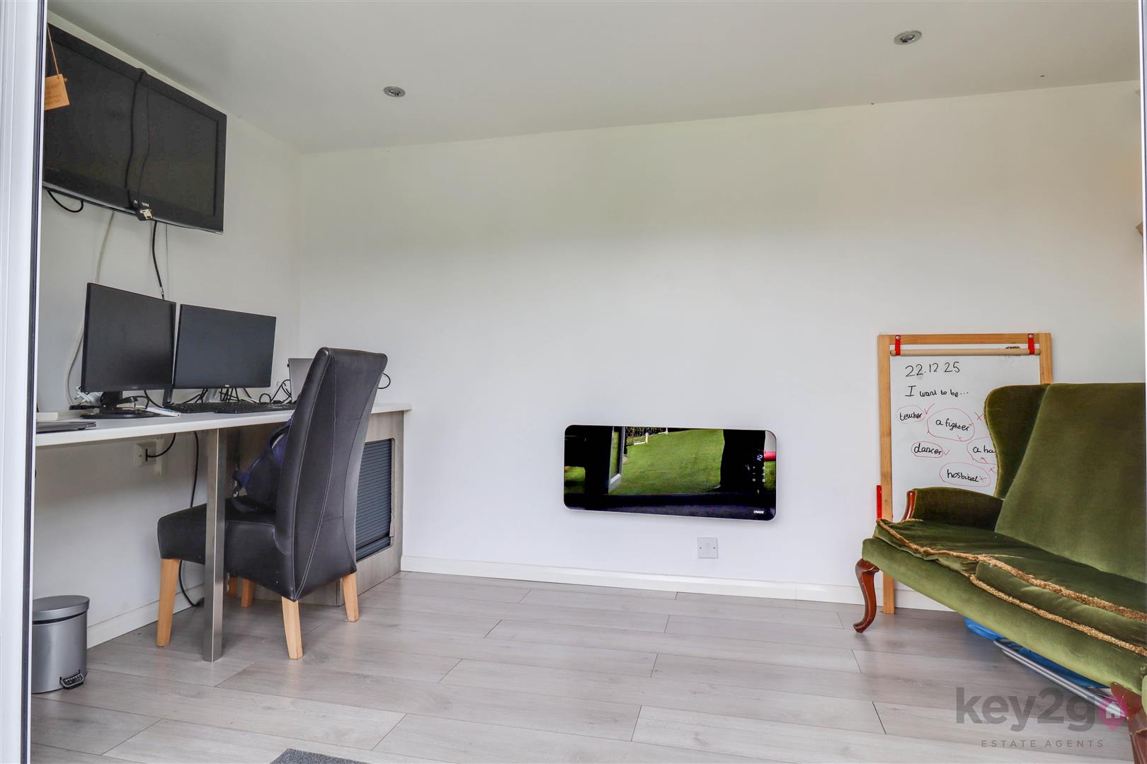 The lounge offers a warm and cosy retreat, complete with a stylish feature media wall, and flows seamlessly into the rear family room. This versatile additional reception space is flooded with natural light and benefits from double doors opening out to the garden, as well as access back through to the kitchen—ideal for modern family living and entertaining.
