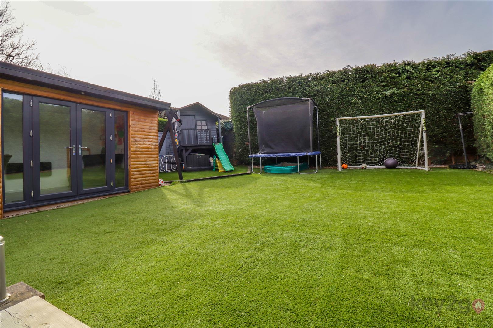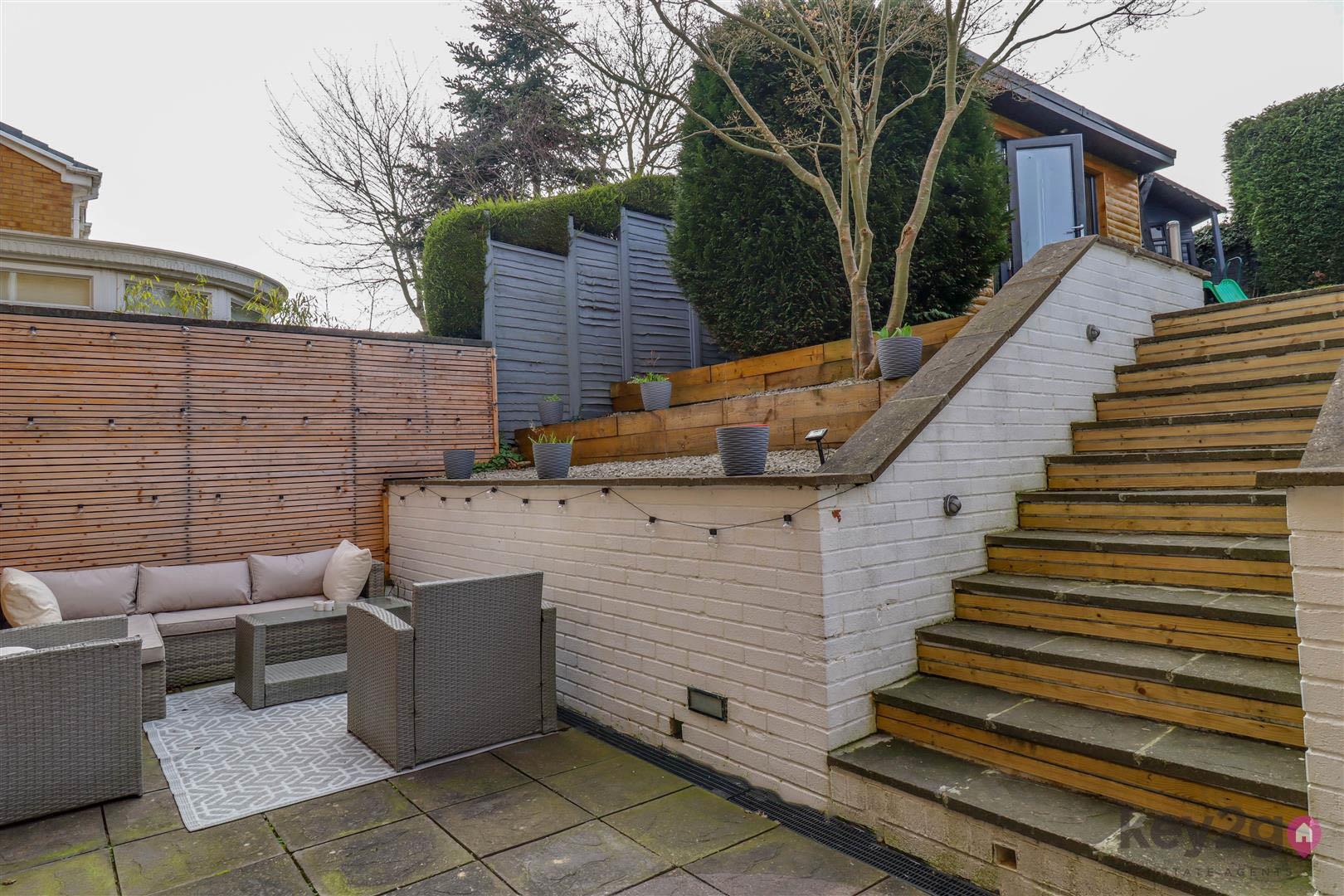 The rear garden is attractively tiered, featuring a patio area ideal for outdoor dining and entertaining. Steps lead up to an artificial lawn, offering a low-maintenance outdoor space, while mature conifers line the boundary, providing a good degree of privacy. The garden also benefits from access to a versatile home office/outhouse.