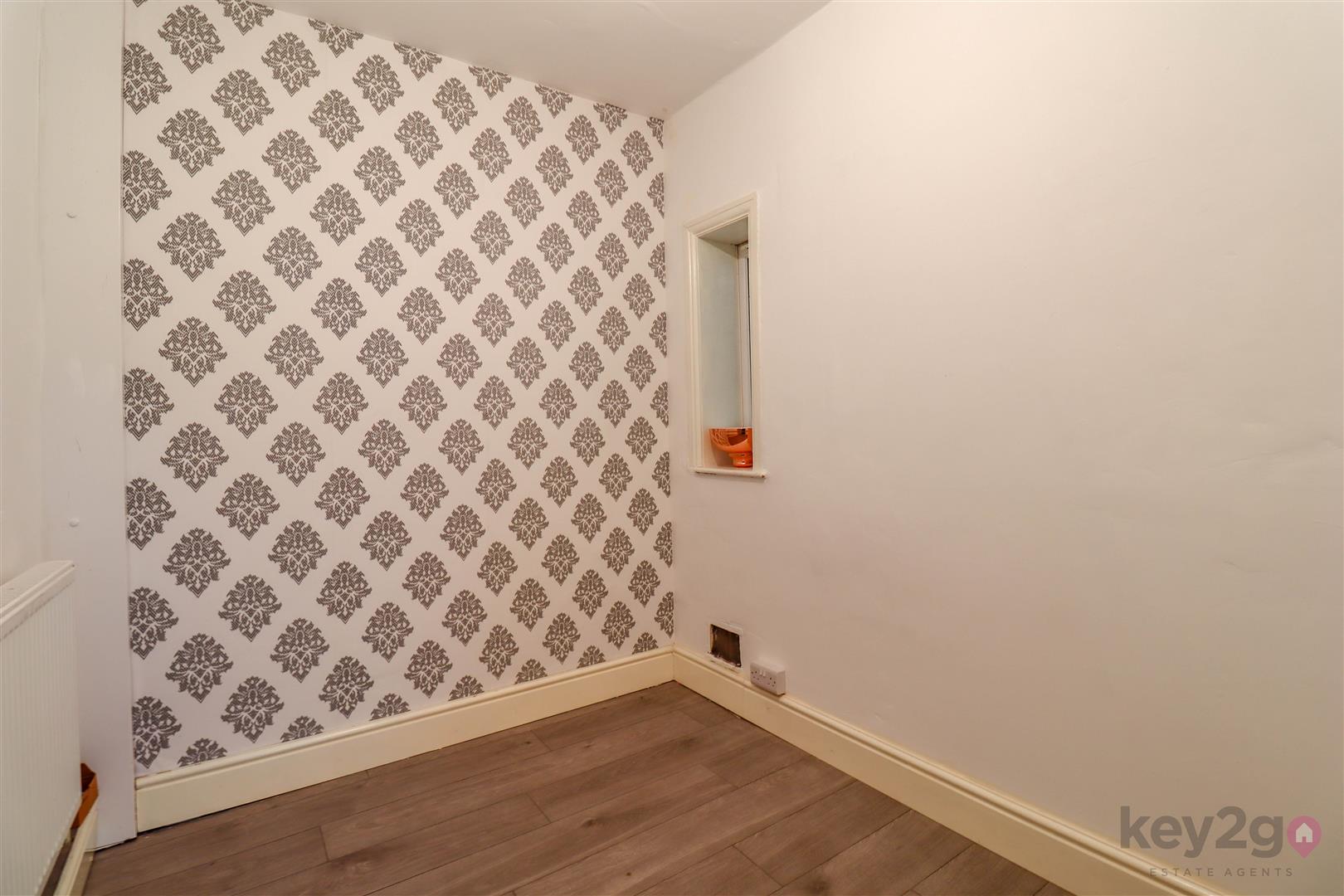 Comprising of a feature wallpapered wall and laminate flooring. Ceiling light and obscure glass window.