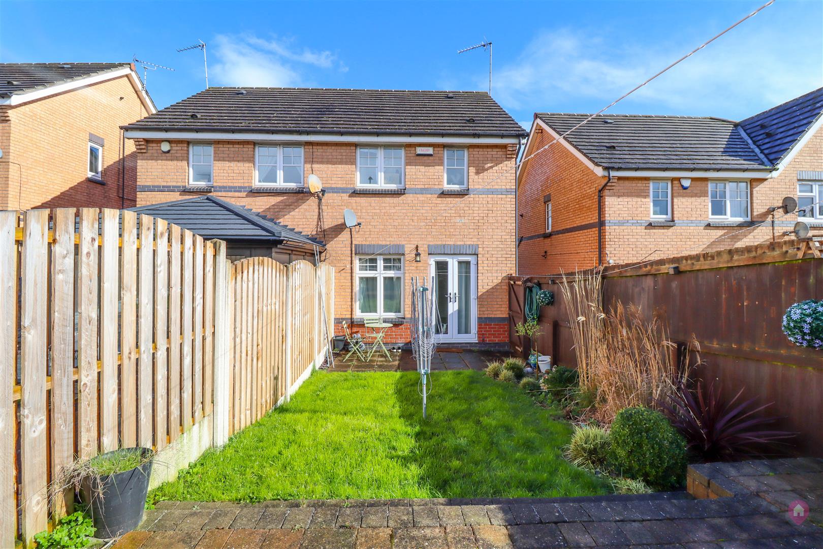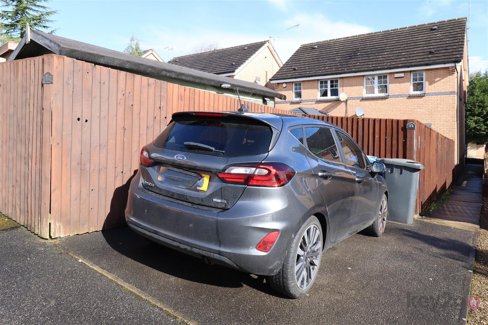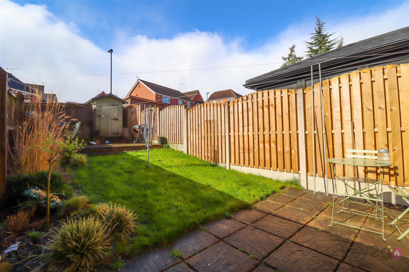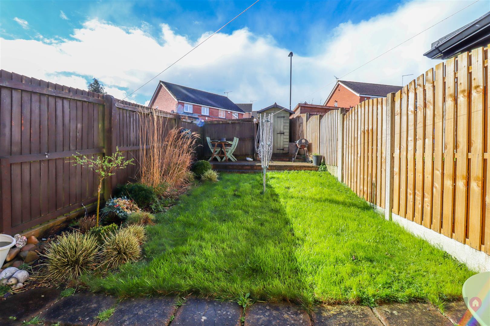 To the rear of the property is a driveway providing off-road parking for one vehicle. A gate gives access to the enclosed rear garden, which has been thoughtfully arranged to include two patio areas, ideal for outdoor seating and entertaining, with a lawn set between. The garden also benefits from a useful shed and is fully enclosed by fencing, offering a good degree of privacy.