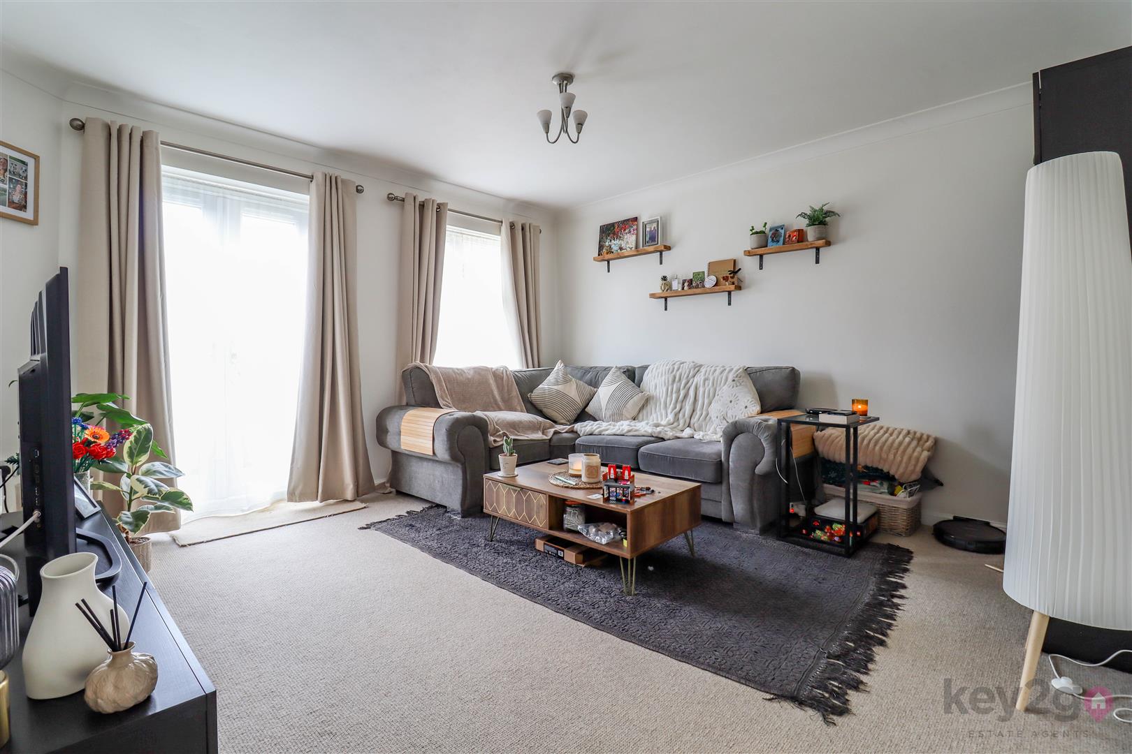 To the rear of the property is a bright and airy living area. Patio doors open directly onto the rear garden, while a useful understairs storage cupboard adds to the practicality of the home.