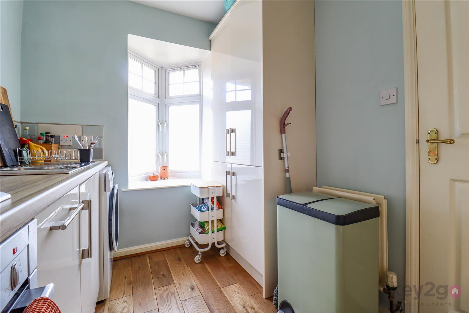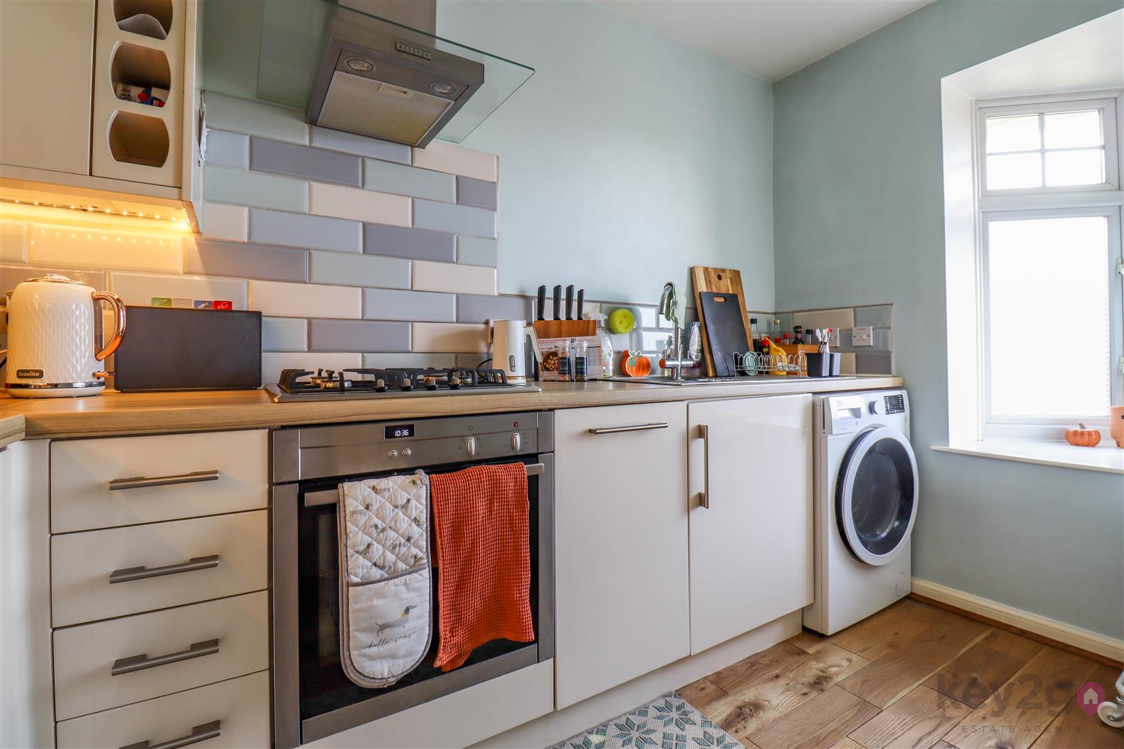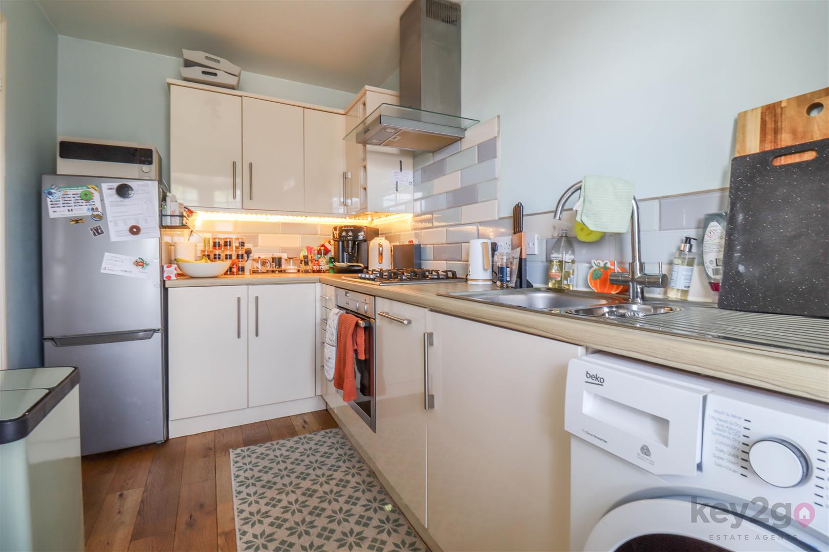 Entrance is via a useful and welcoming hallway, with stairs rising to the first floor. A door leads through to the stylish kitchen, fitted with a range of high gloss wall and base units, with a window to the front aspect.