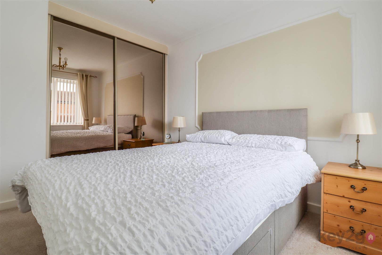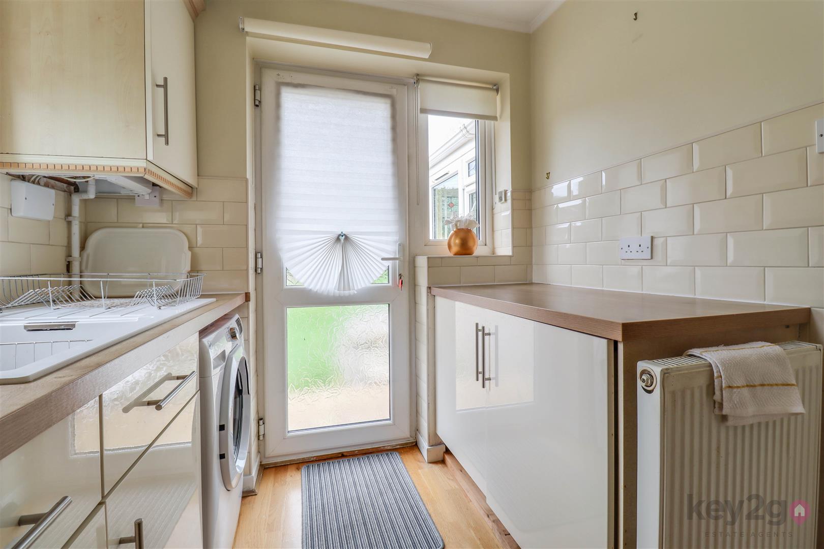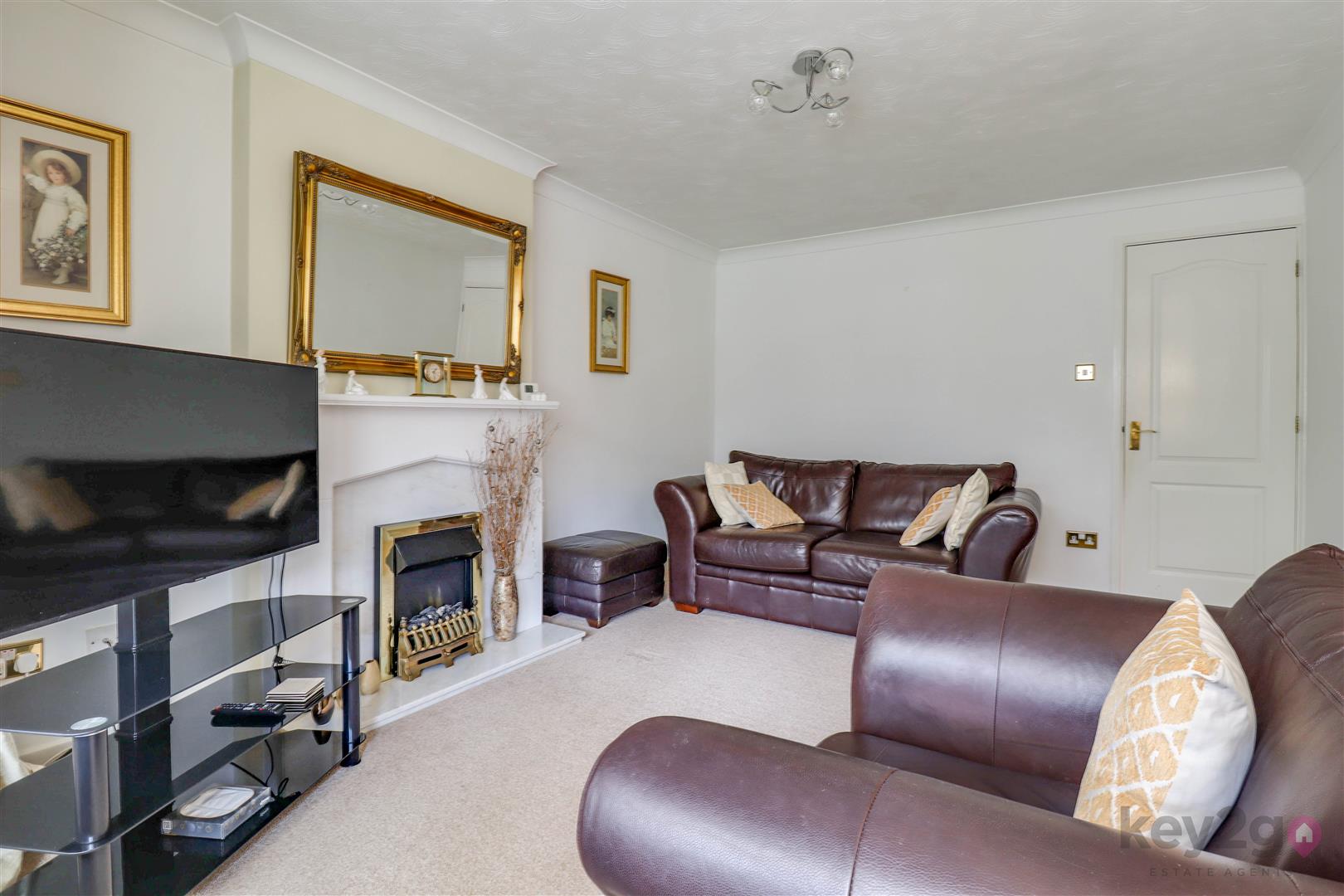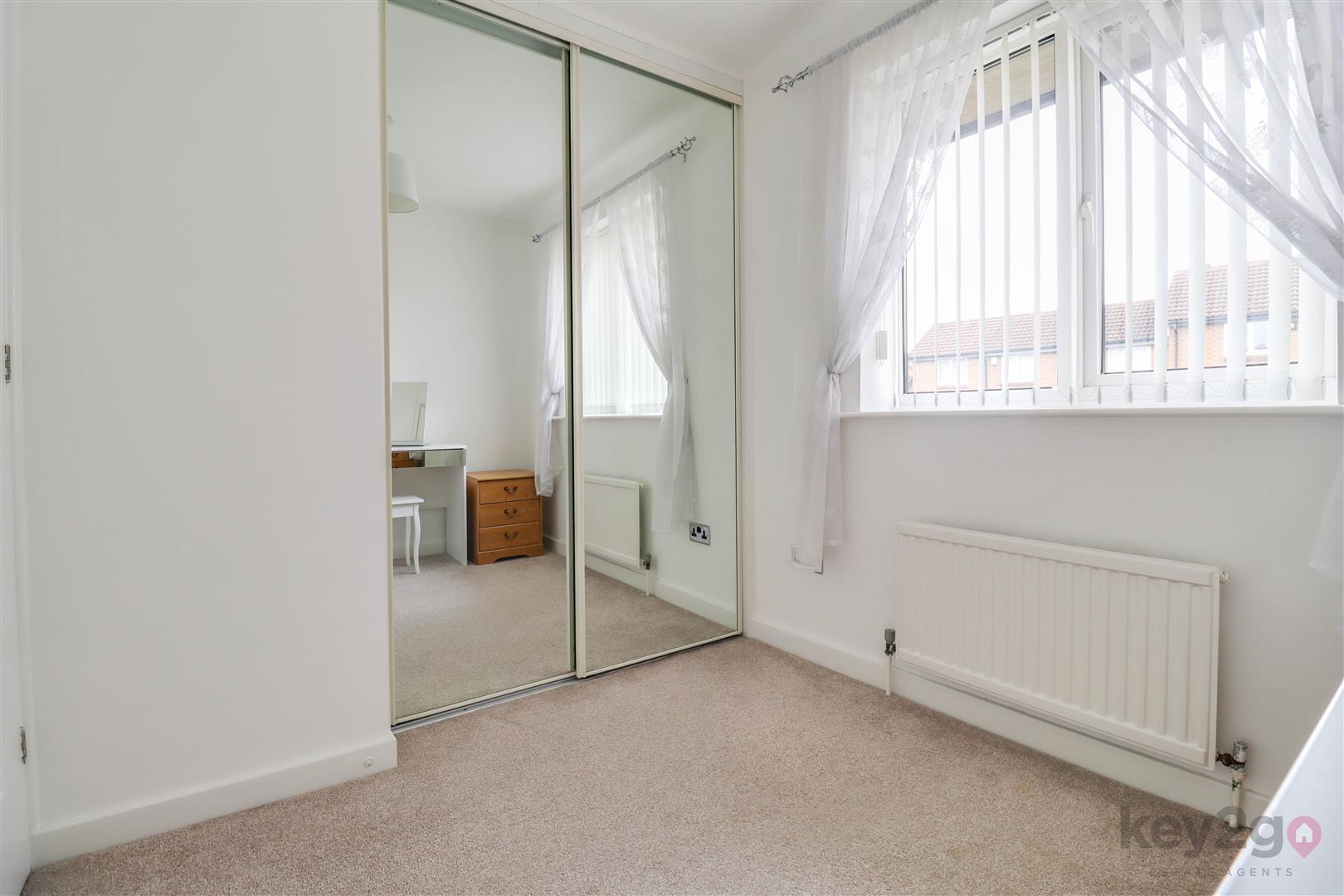 A side composite door opens into a welcoming hallway with doors to all rooms. To the front is the second bedroom, a single room with a front-facing window and fitted wardrobes. The modern shower room comprises a shower cubicle, vanity wash basin and close-coupled WC, with additional storage provided by a store cupboard and airing cupboard. The bright double bedroom is also positioned to the front and benefits from fitted wardrobes. To the rear of the property is the living room, featuring a fireplace and sliding doors leading into the conservatory. The modern kitchen offers space for a freestanding cooker and washing machine, with integrated fridge and freezer, and a UPVC door providing access to the rear garden.