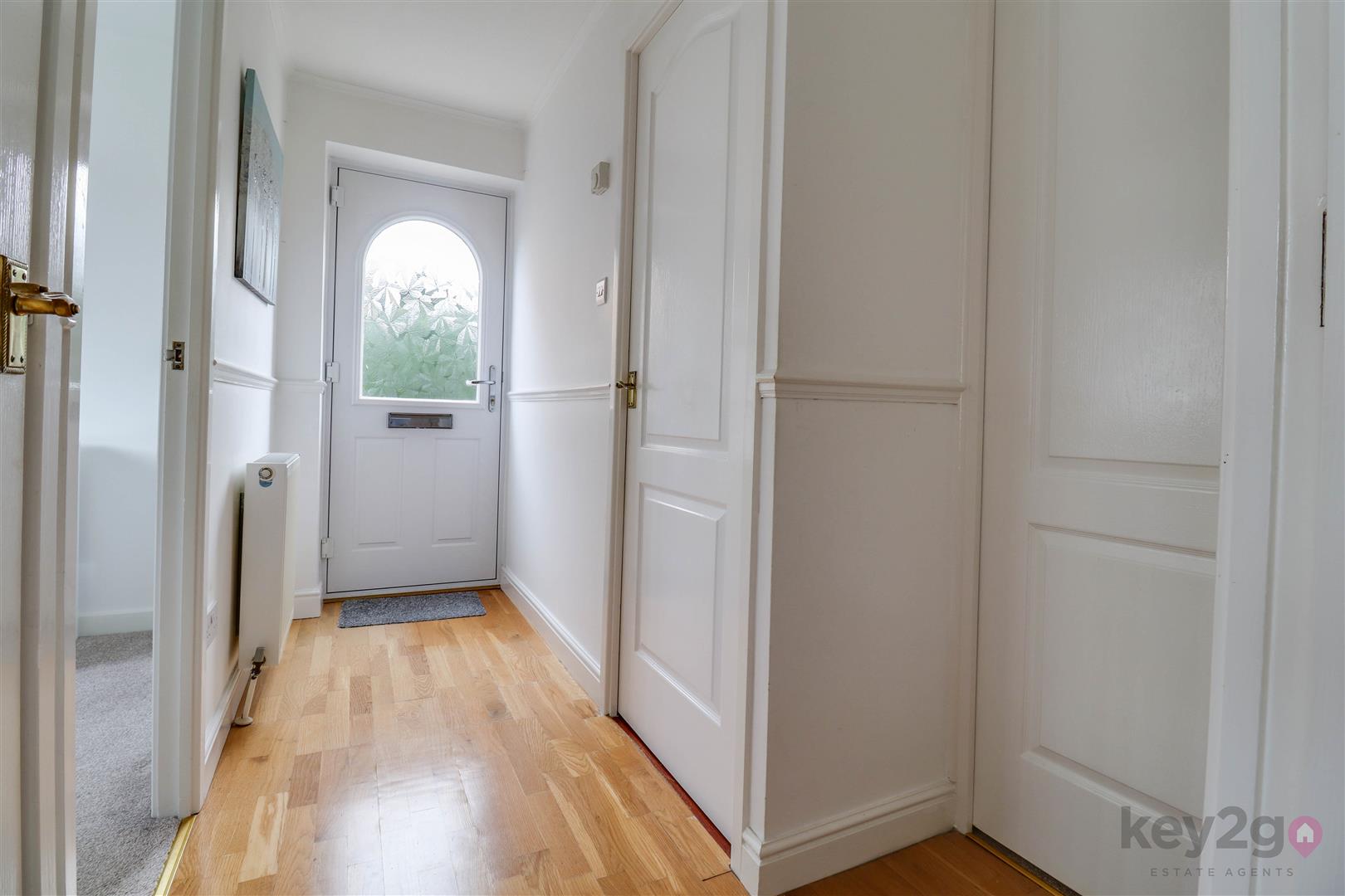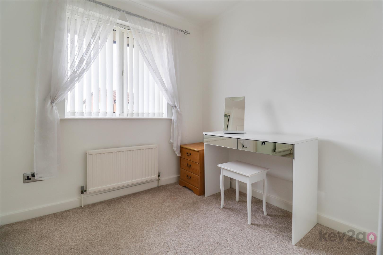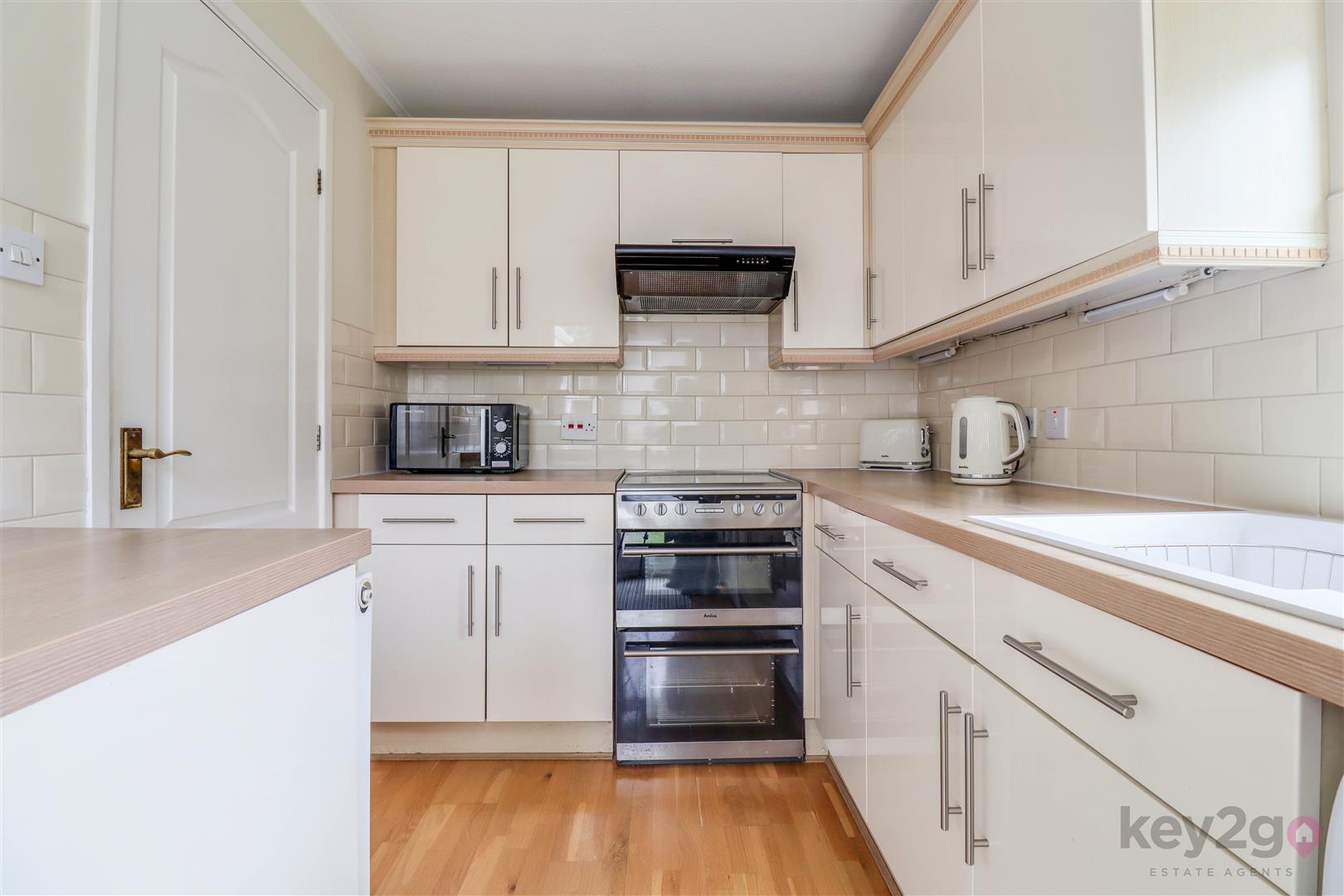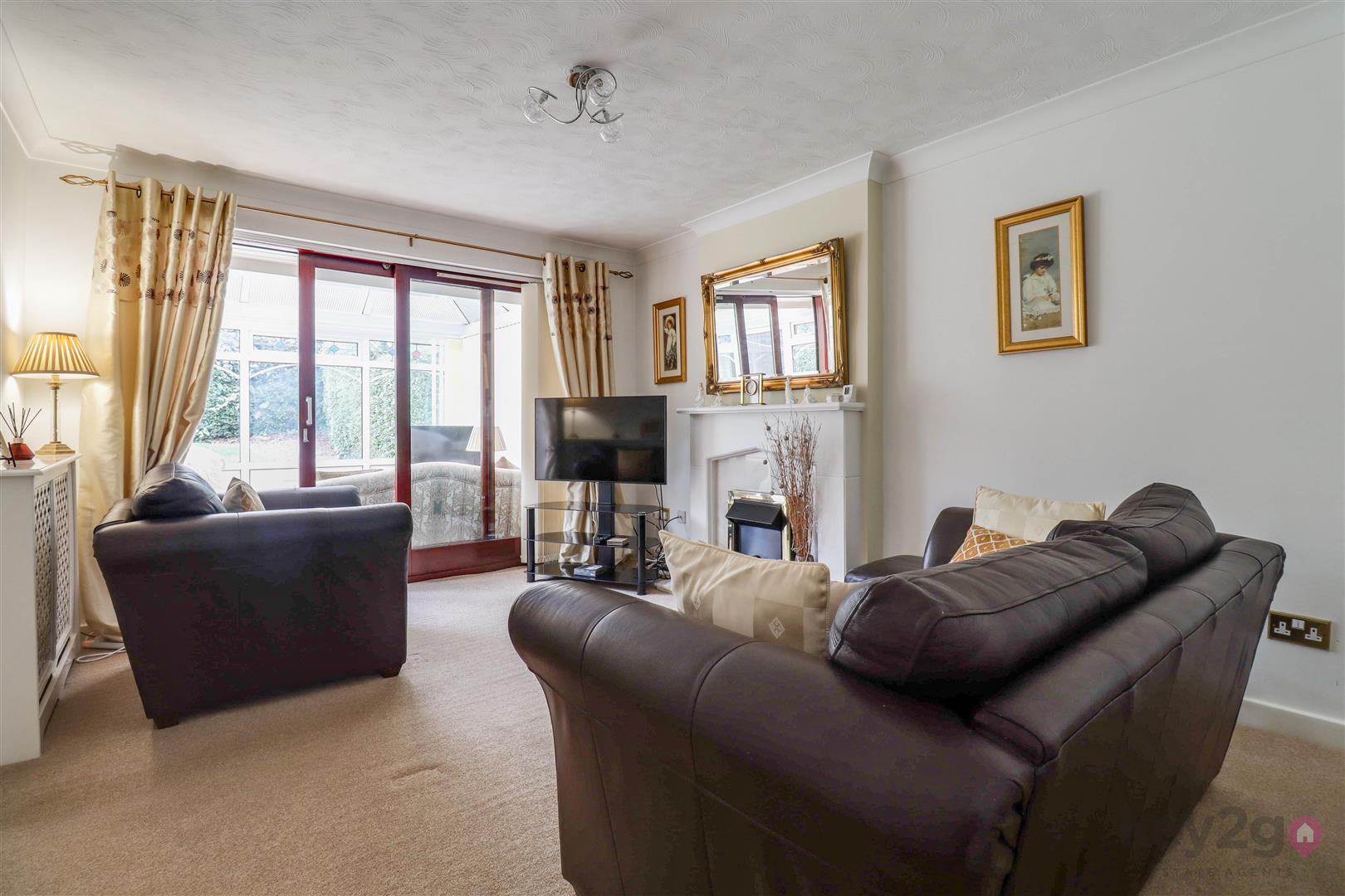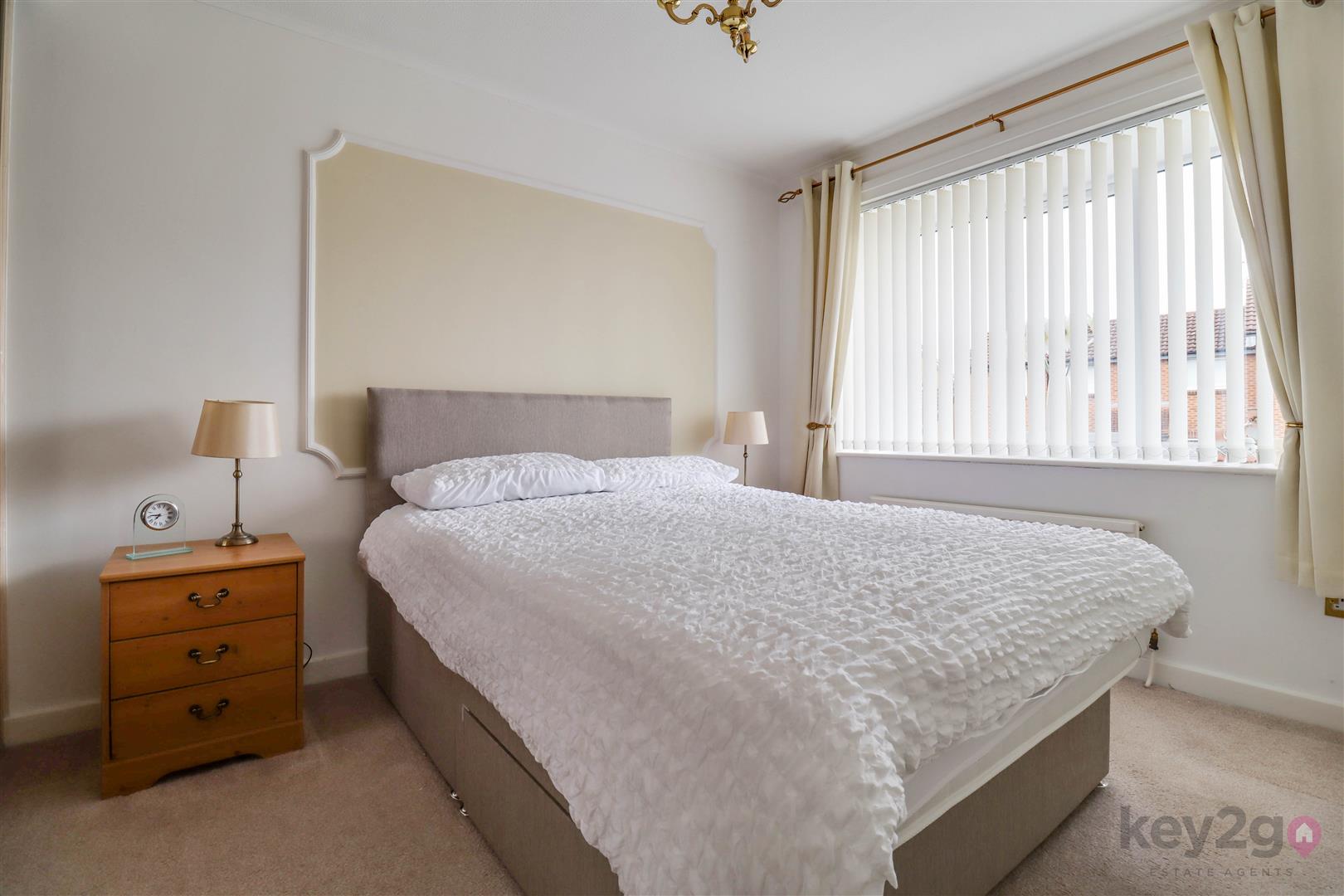 A side composite door opens into a welcoming hallway with doors to all rooms. To the front is the second bedroom, a single room with a front-facing window and fitted wardrobes. The modern shower room comprises a shower cubicle, vanity wash basin and close-coupled WC, with additional storage provided by a store cupboard and airing cupboard. The bright double bedroom is also positioned to the front and benefits from fitted wardrobes. To the rear of the property is the living room, featuring a fireplace and sliding doors leading into the conservatory. The modern kitchen offers space for a freestanding cooker and washing machine, with integrated fridge and freezer, and a UPVC door providing access to the rear garden.