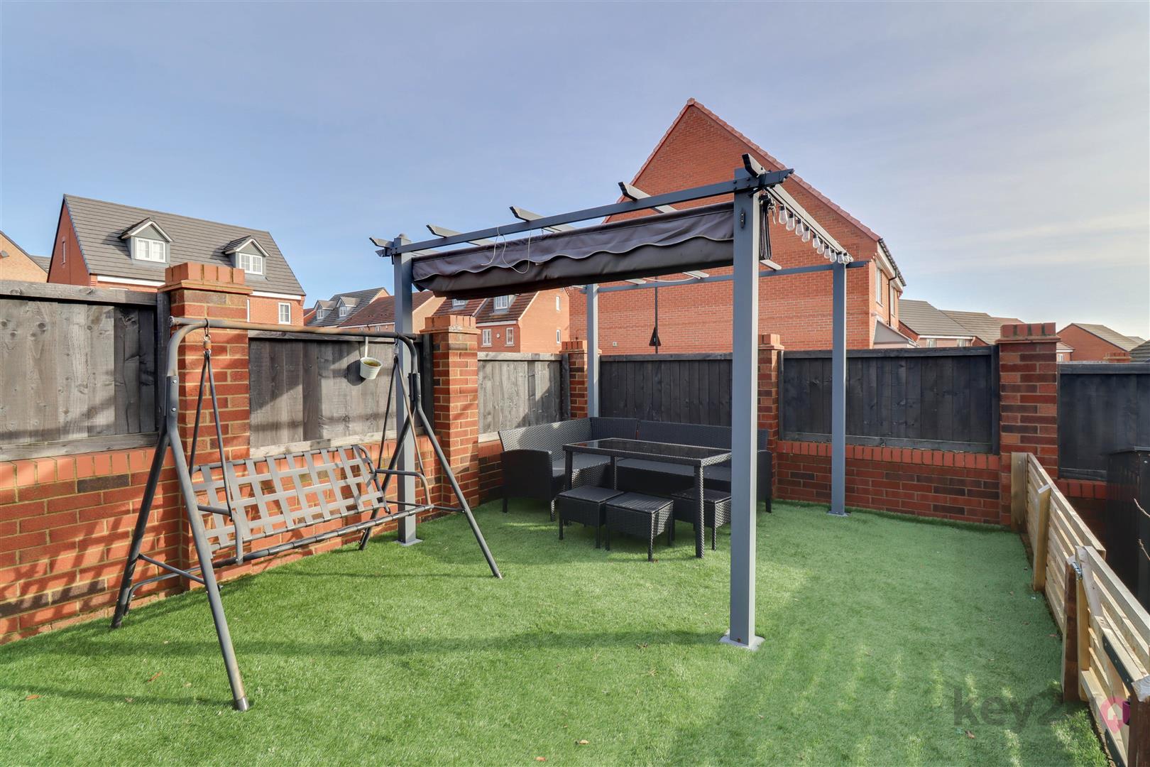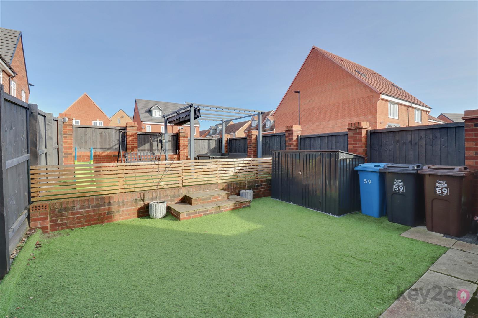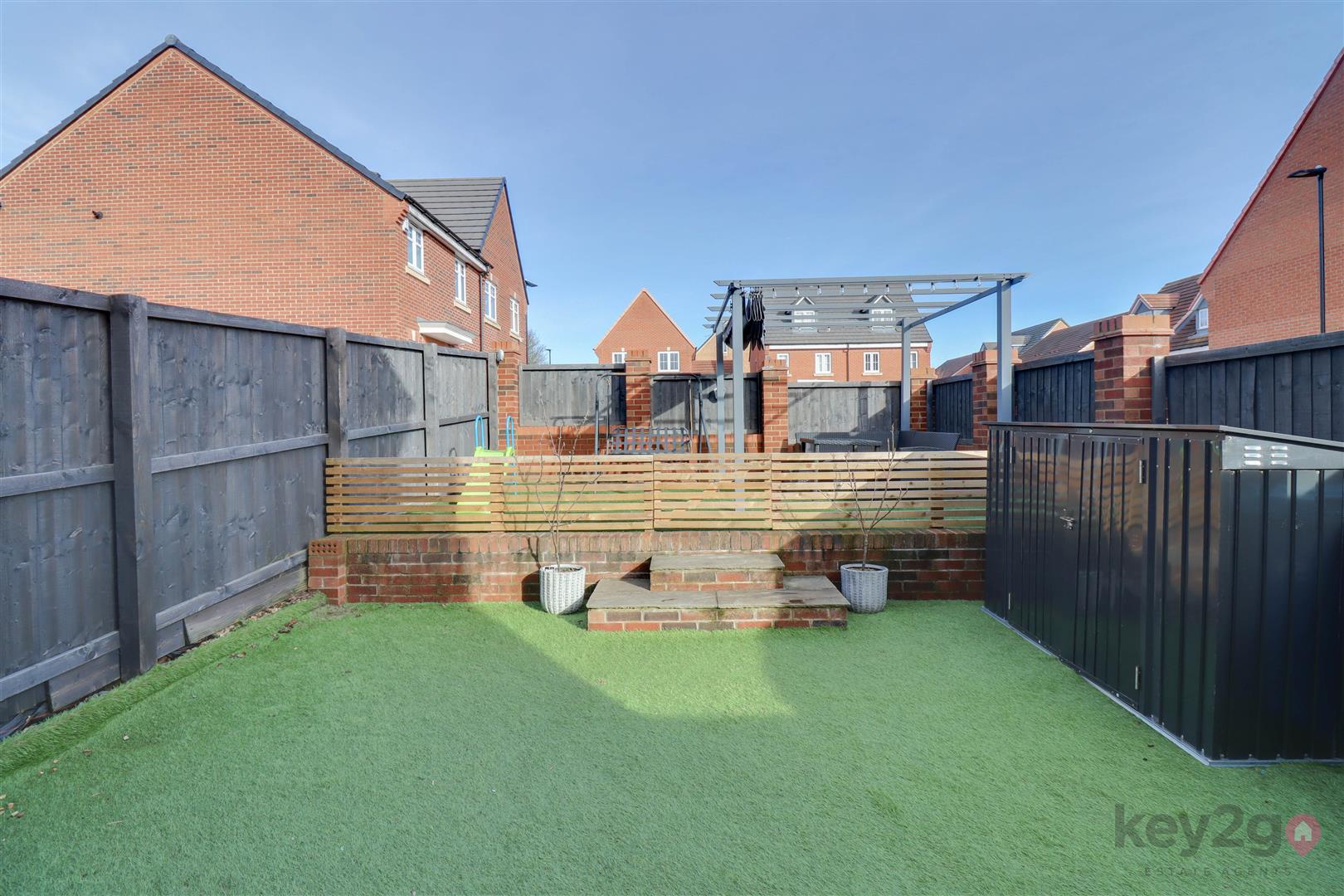 The rear garden is enclosed and low maintenance, featuring an artificial lawn with steps leading up to a further artificial lawned area, all enclosed by fencing.