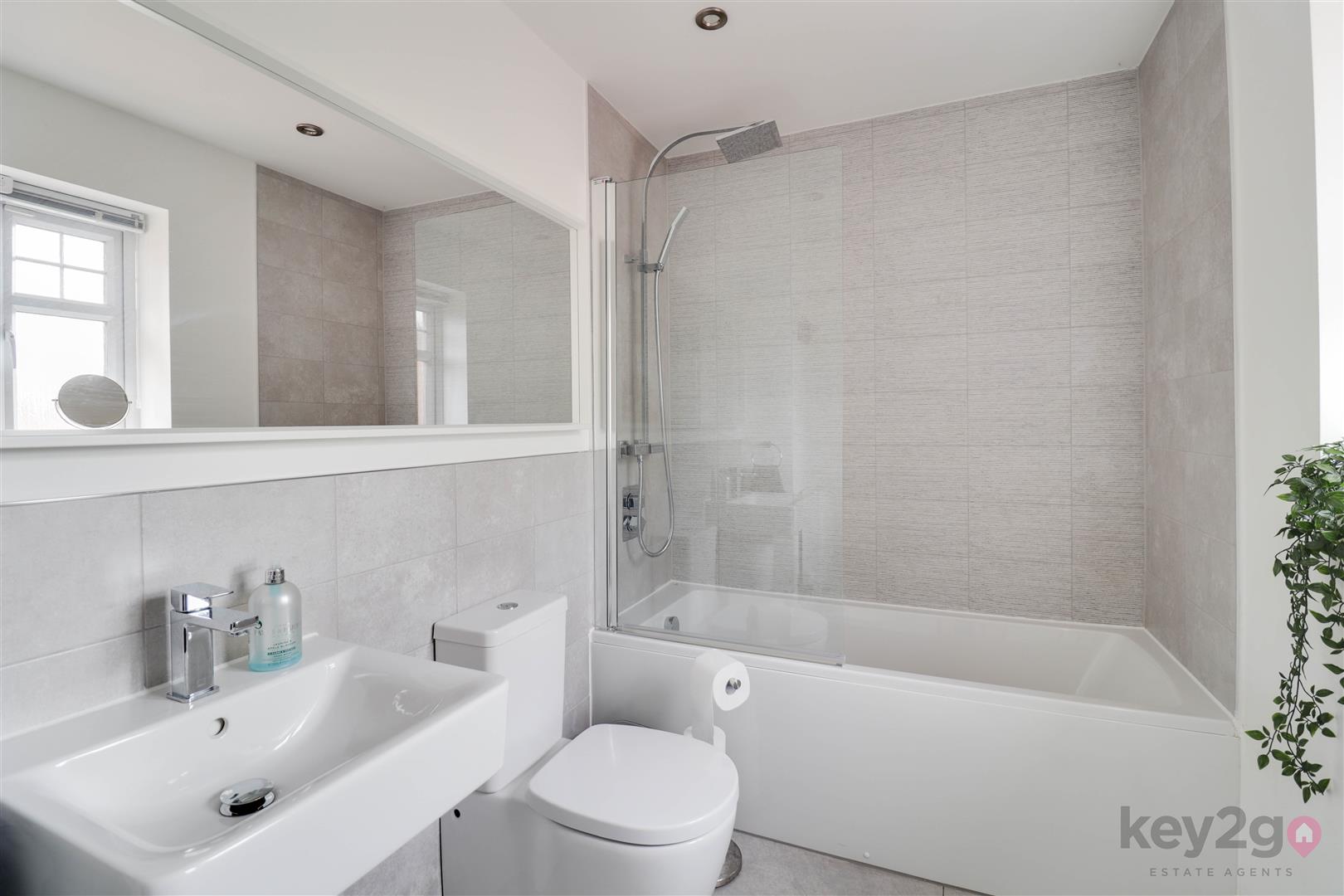 Stairs rise to the first-floor landing with a large storage cupboard and a door to the master bedroom, which has an ensuite with a WC, sink, and shower. Further doors lead to two bedrooms, both with built-in wardrobes. There is also a door to the bathroom with a bath, sink, and WC.