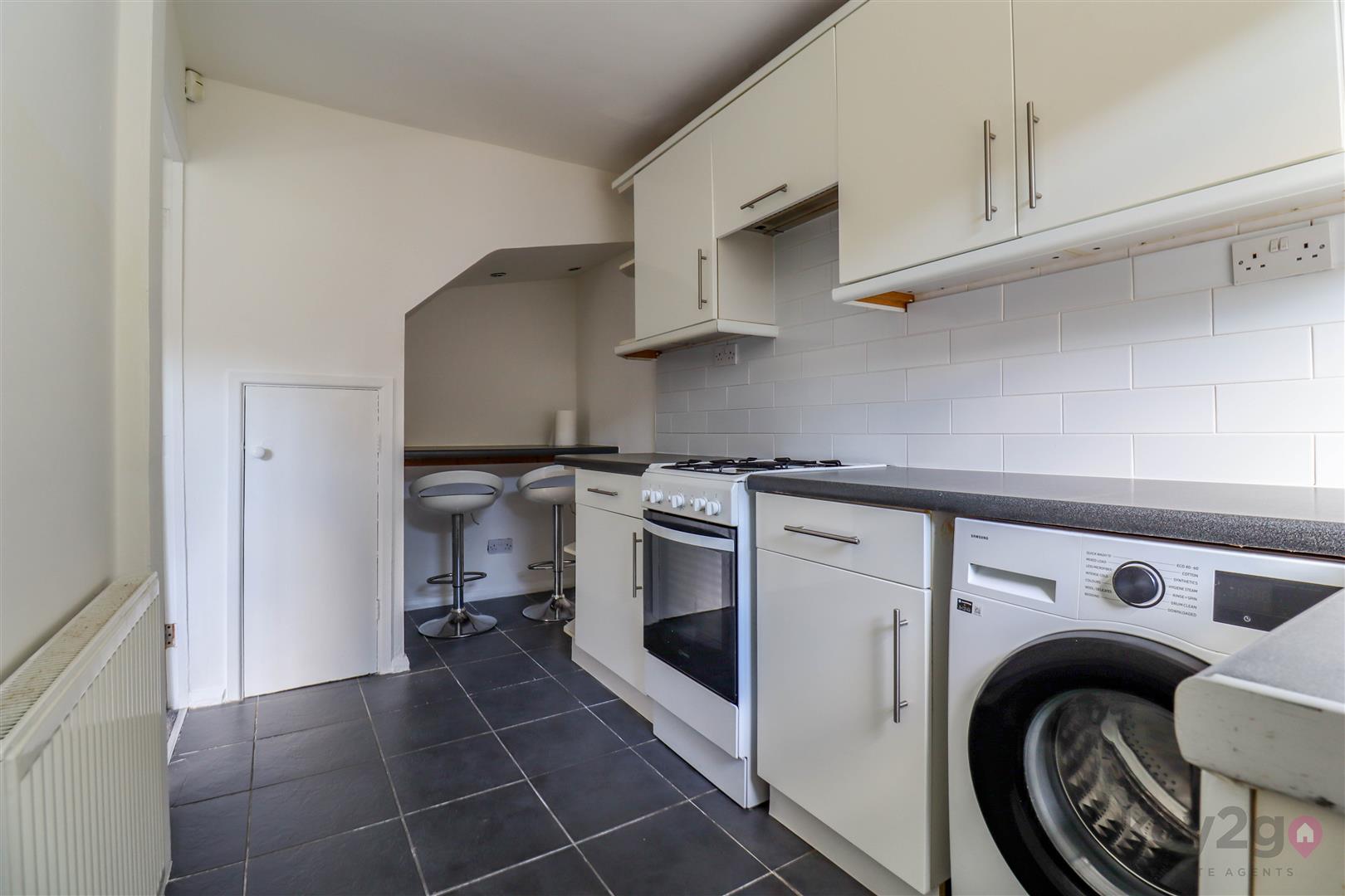 The property features a welcoming porch area with access to the lounge, which includes a front-facing window, stairs leading to the first floor, and a door through to the kitchen. The modern kitchen is fitted with high-gloss units, an oven and hob, and offers space for appliances.