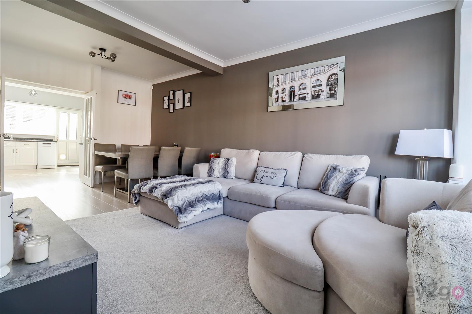 The hallway features the stair rise to the first floor and a door to the open, bright, and airy lounge/diner, complete with a bay window to the front and a storage cupboard. A further door leads to the large kitchen, fitted with high-gloss units, a breakfast bar, and freestanding appliances.
