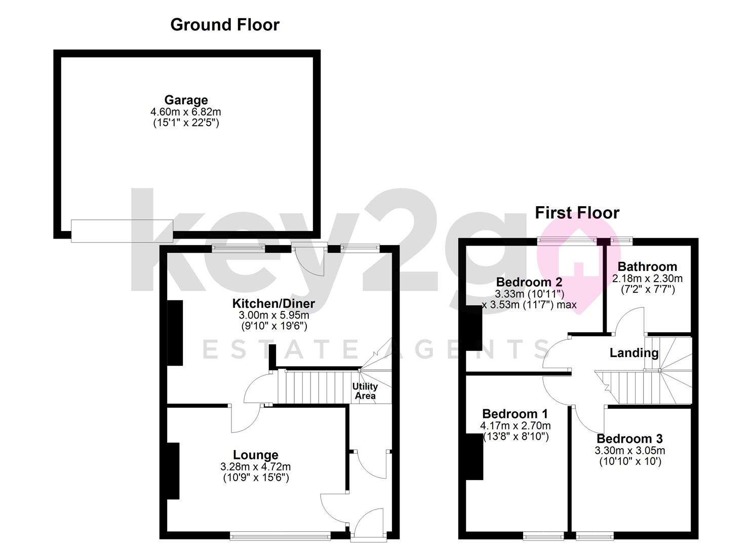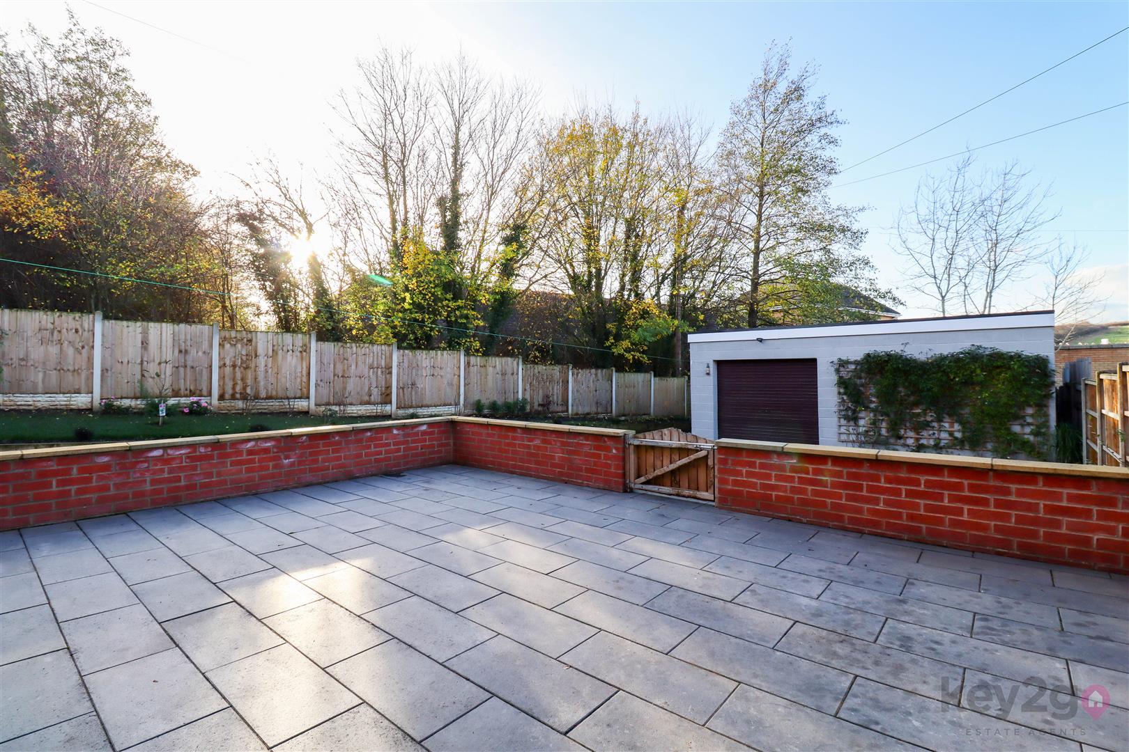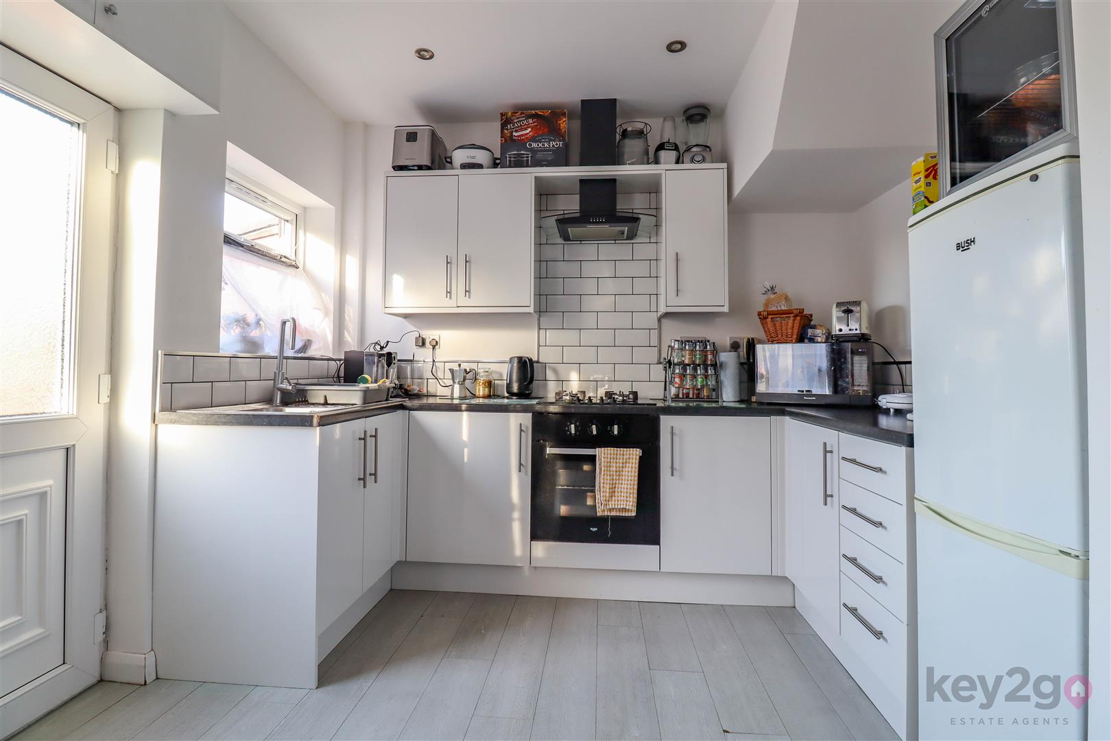 The entrance hallway provides access to a useful utility area and leads to the lounge, which features a media wall and wood-effect flooring. A doorway opens into the stylish and spacious kitchen/diner, which includes an integrated oven, hob, and extractor fan, with ample space for a dining table. There are two rear windows and a doorway leading to the rear garden, as well as a door giving access to the stairs.
