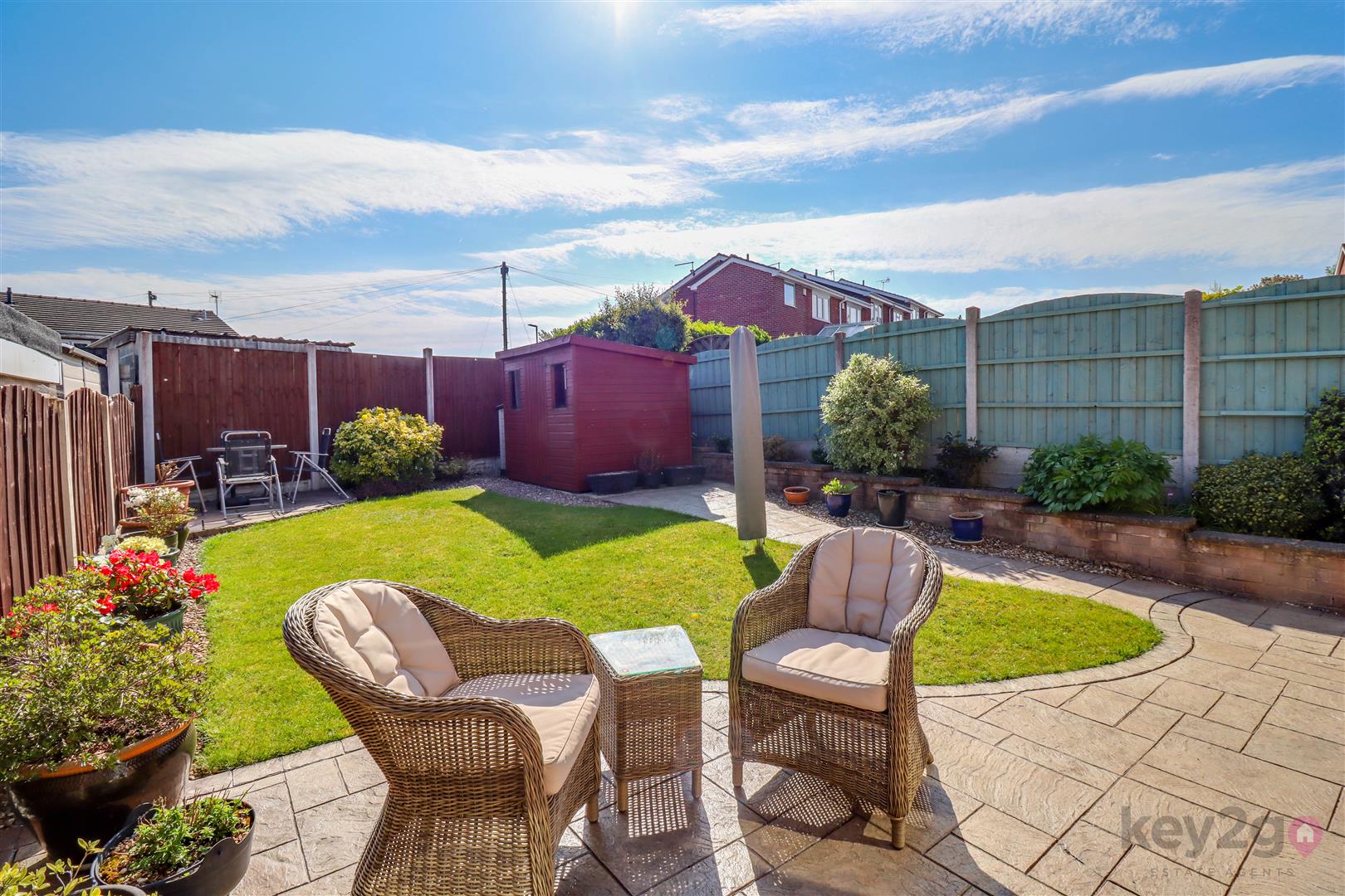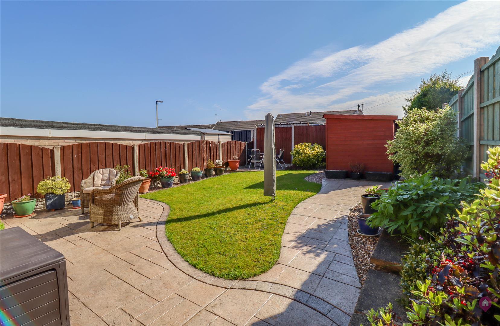 To the front and side is a patterned concrete driveway providing ample off-road parking, complemented by shrubbery. To the rear is a continuation of patterned concrete patio, with pebbled edging and a lawned area. The garden also benefits from a shed and fenced boundaries.