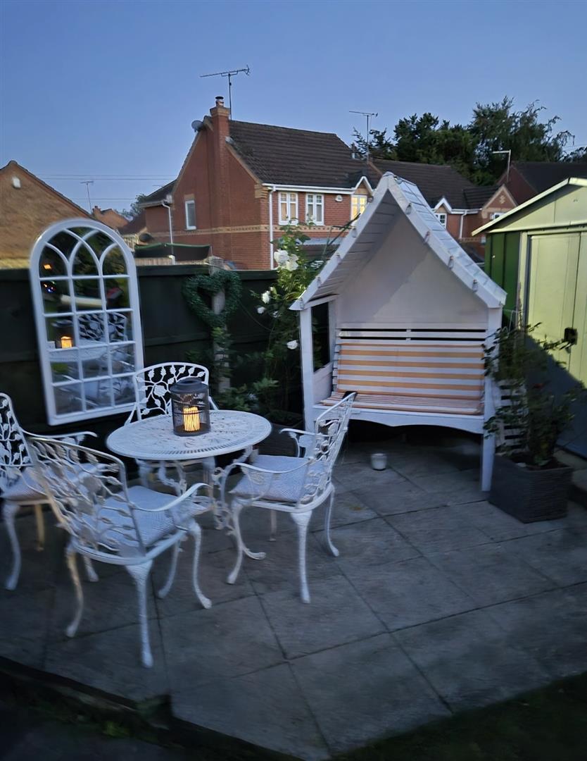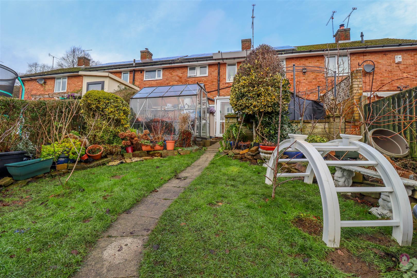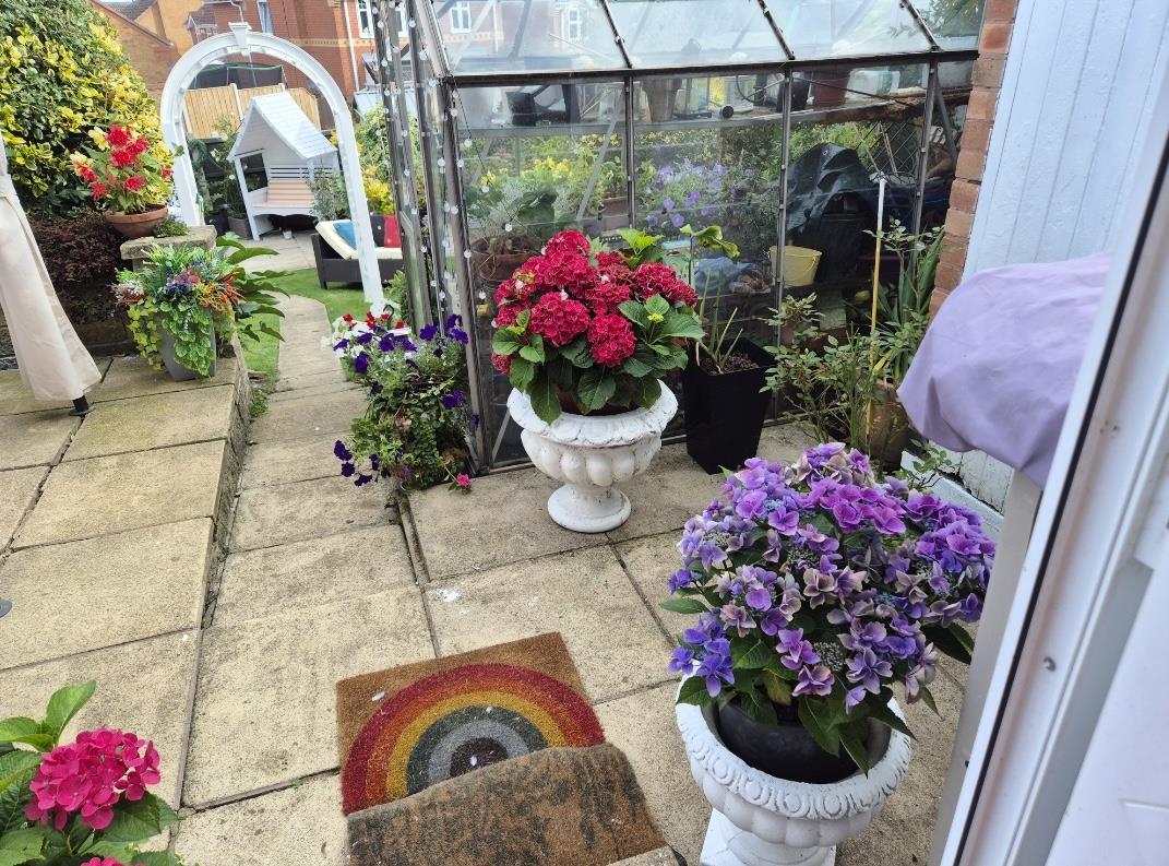 To the front of the property there is off-road parking for one car, along with a lawn and flower bed. Steps lead up to two front entrance doors. The rear garden features a patio area, lawn, further patio space, shed and greenhouse, with established flower beds. There is shared access for vendors and a rear gate providing access to the back of the house.
