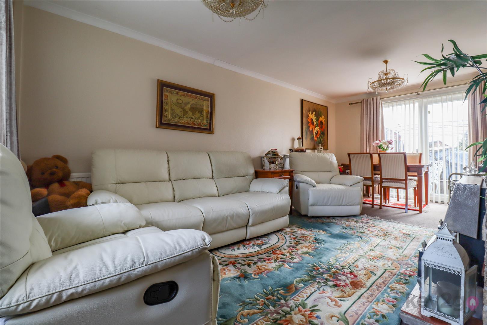 A useful entrance porch leads to a composite door opening into the hallway, which features a storage cupboard and stairs rising to the first floor. A door leads into the lounge/diner, a spacious room spanning the full width of the house and benefiting from sliding patio doors opening to the garden. From here, there is access to the kitchen and a door leading to the utility room. The utility room offers space and plumbing for a washing machine and provides access to the rear porch, which in turn leads out to the garden, along with a second door giving access to the front.