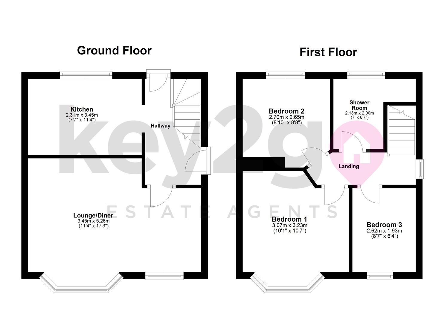 The stairs and landing are neutral with carpet, a window, and access to the loft. Bedroom one is a double with a neutral finish, carpet, and a bay window. Bedroom two is a double with carpet and a window, while bedroom three is a single with carpet and a window. The shower room includes a large walk-in shower unit with glass sliding doors, a sink with storage, a toilet, tiled walls, vinyl flooring, and an obscure window.