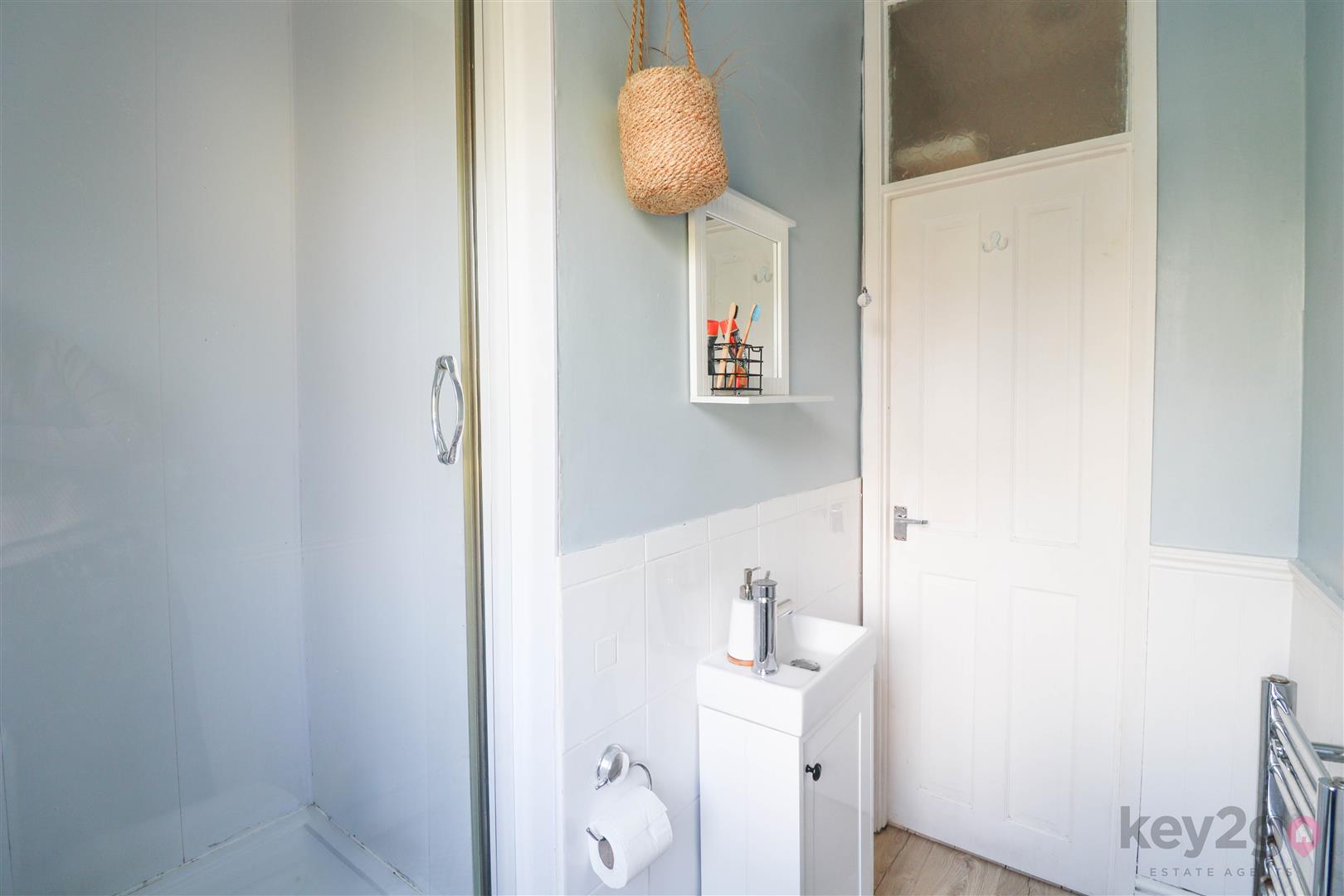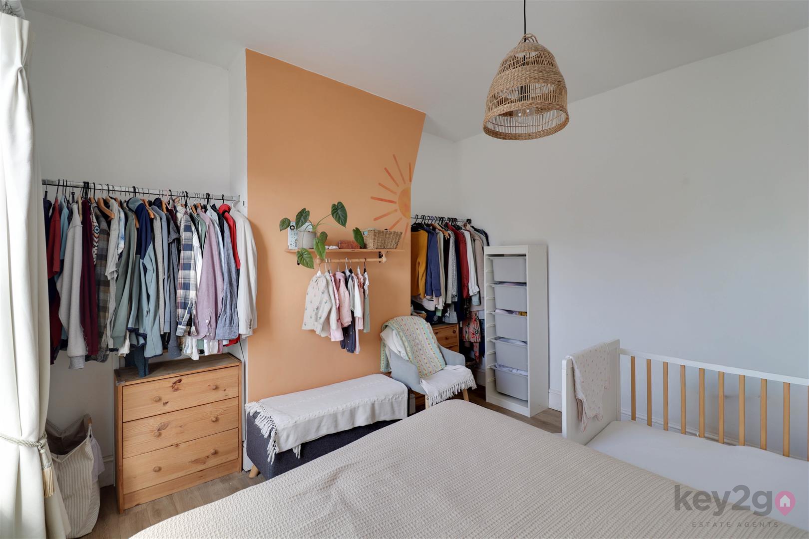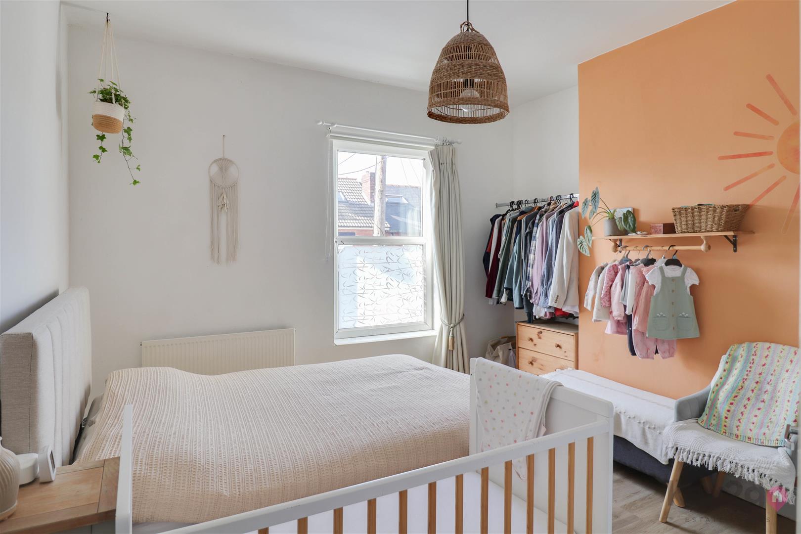 To the first floor are two well-proportioned bedrooms. The main bedroom is a comfortable double with a feature wall and plenty of natural light, while the second bedroom is a generous single, ideal as a bedroom, nursery, or home office. The bathroom is modern and well maintained, featuring a walk-in shower, WC, and sink with storage.