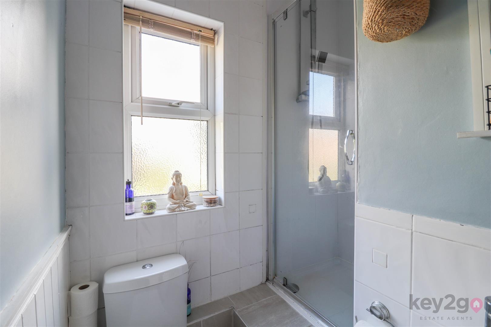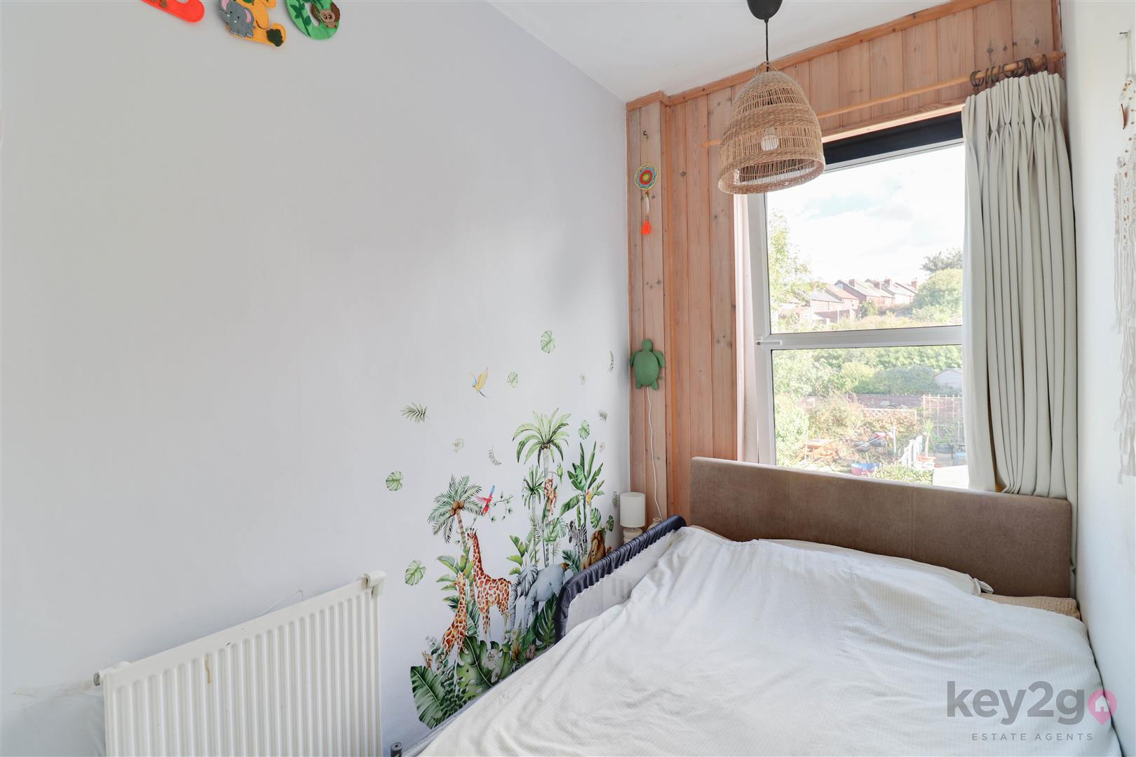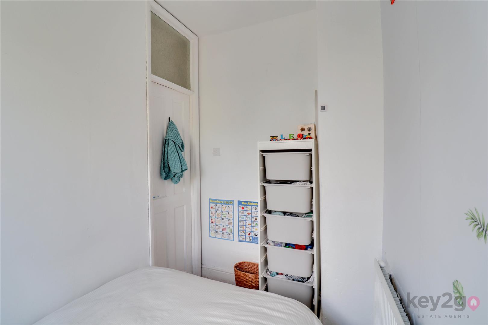 To the first floor are two well-proportioned bedrooms. The main bedroom is a comfortable double with a feature wall and plenty of natural light, while the second bedroom is a generous single, ideal as a bedroom, nursery, or home office. The bathroom is modern and well maintained, featuring a walk-in shower, WC, and sink with storage.