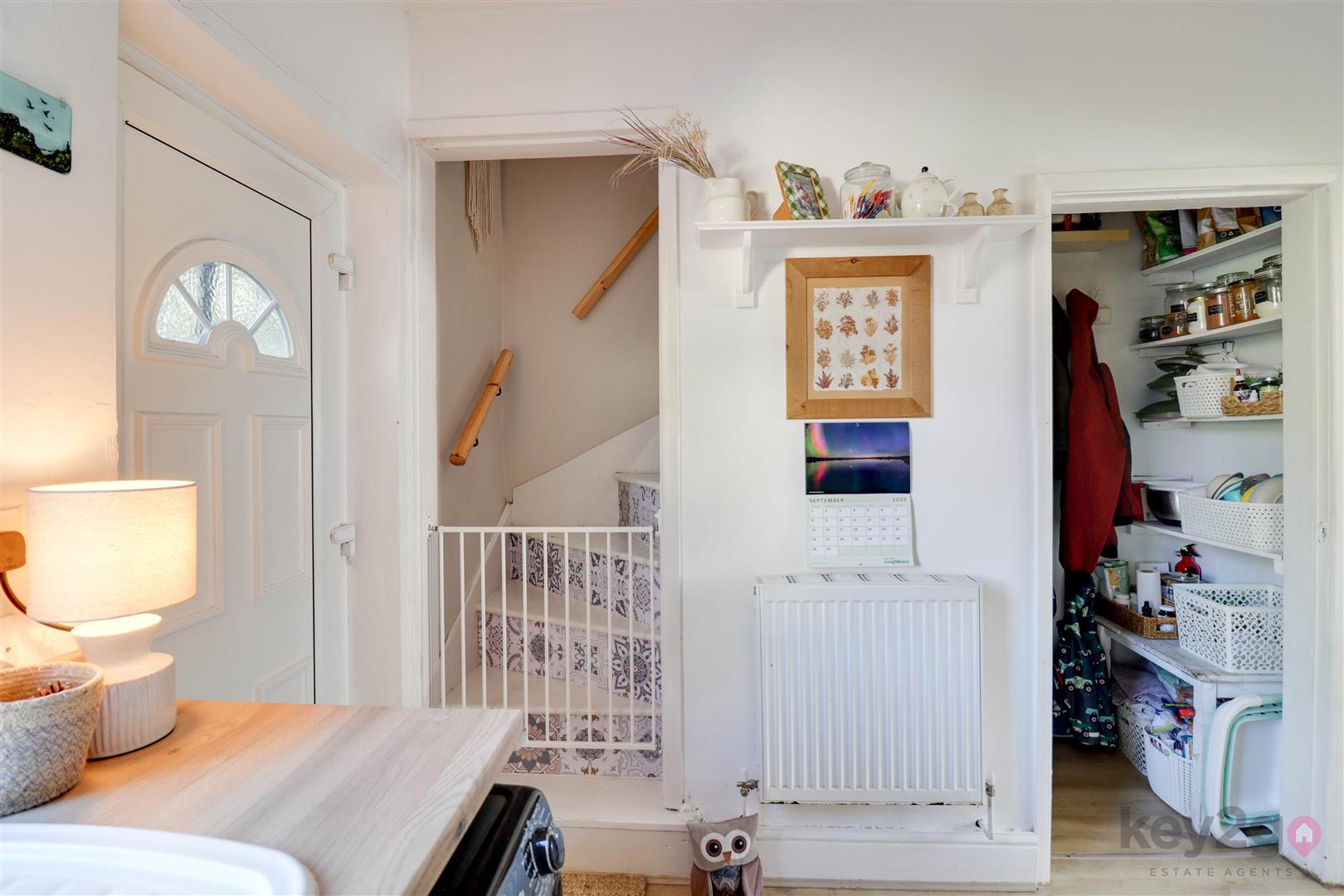 A uPVC door opens into a bright and spacious lounge, finished in modern neutral décor and featuring a fireplace opening and useful storage. This leads through to a contemporary kitchen fitted with a range of units, contrasting worktops, an integrated oven, gas hob with extractor, and space for appliances. A breakfast bar provides a practical dining area, while a window overlooks the rear garden. A large storage cupboard/pantry and direct garden access complete the space