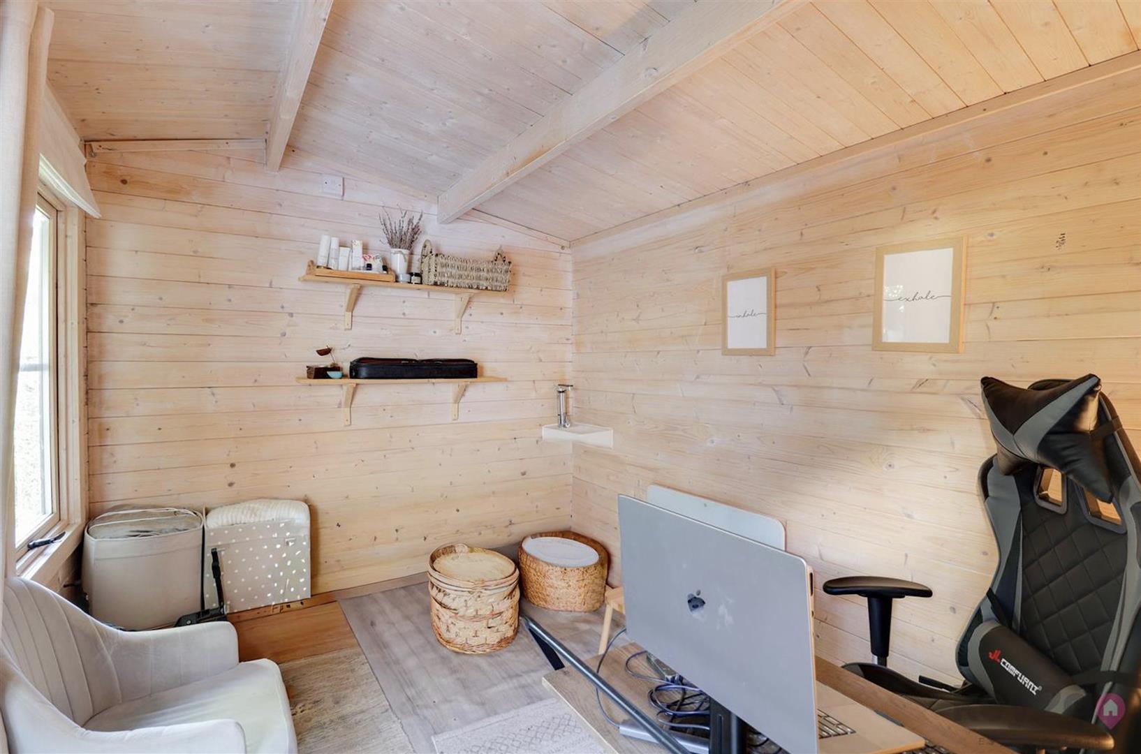 Externally, the property benefits from a private and enclosed rear garden, offering a mix of patio and lawned areas, along with established planting. A standout feature is the fully serviced garden cabin with electricity and water, providing excellent versatility as a home office, studio, or additional living space. The guttering and roof has also recently been replaced. To the front, there is a low-maintenance garden with shared access, and on-road parking is available.