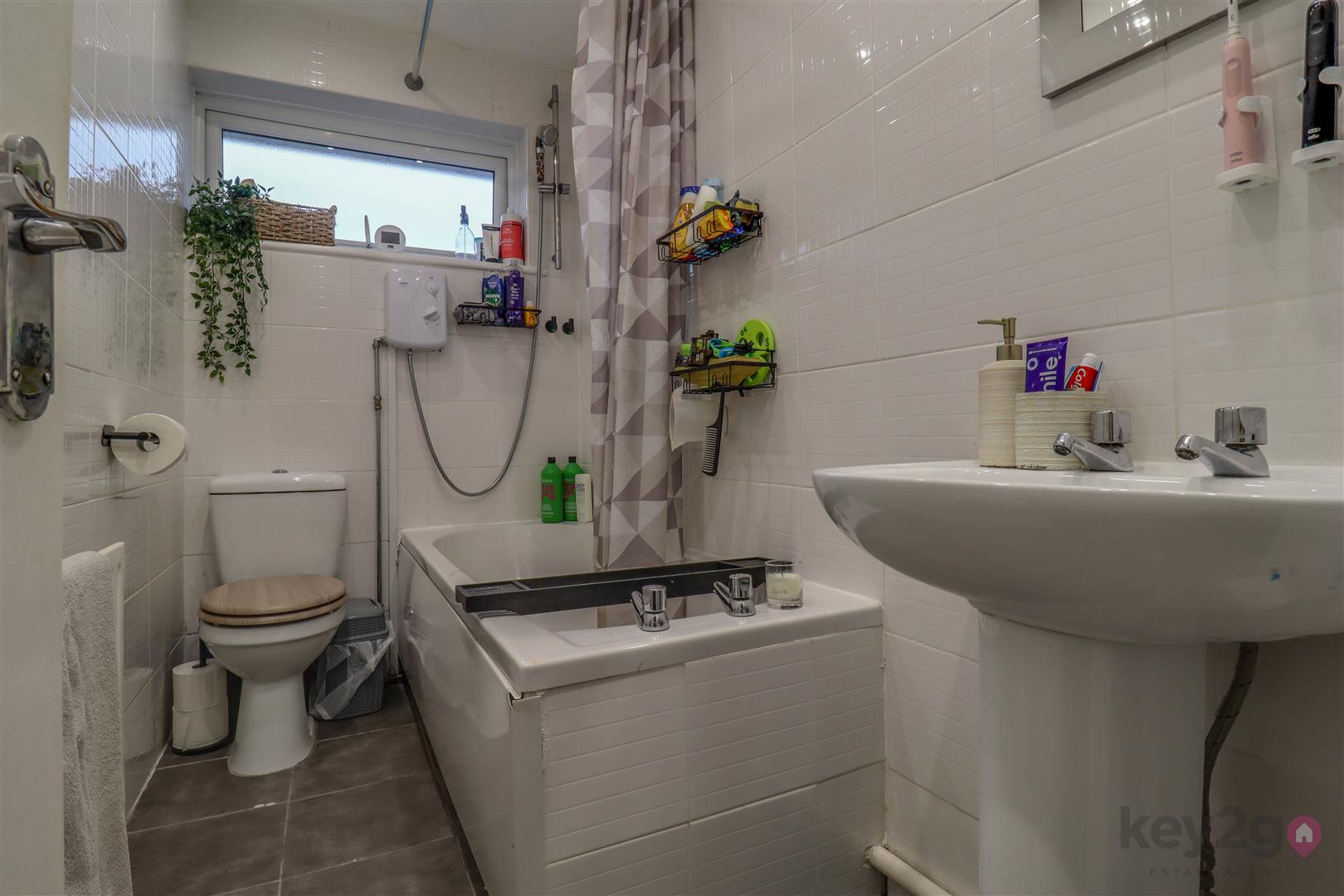 Stairs rise to the first floor landing. There is a good-sized double bedroom to the front with an over-stairs storage cupboard housing the boiler. To the rear is a generous single or small double bedroom. The bathroom is fitted with a bath with overhead shower, close-coupled WC and pedestal wash basin.