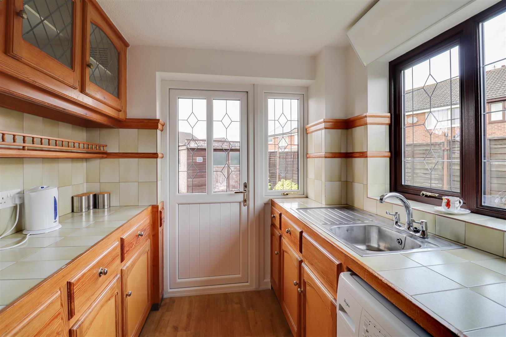 The kitchen is fitted with ample wall and base units with contrasting worktops, a sink and vinyl flooring, and benefits from a window. There is space for a washing machine, oven and fridge/freezer.